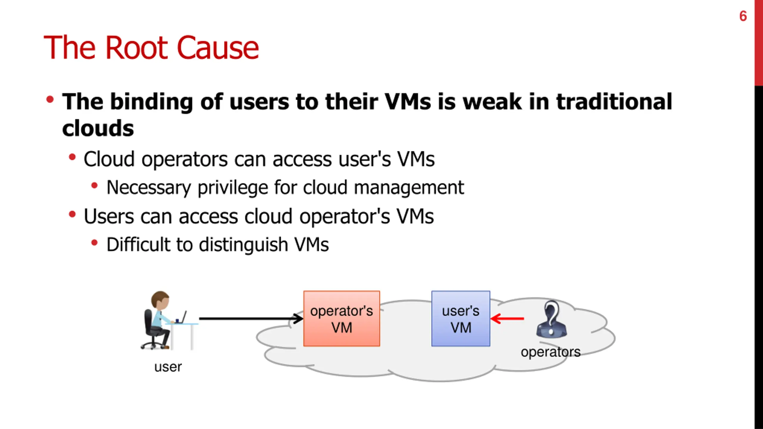 6 The Root Cause The binding of users to their VMs is weak in traditional clouds Cloud operators can access user's VMs Necessary privilege for cloud management Users can access cloud operator's VMs Difficult to distinguish VMs operator's VM user's VM operators user