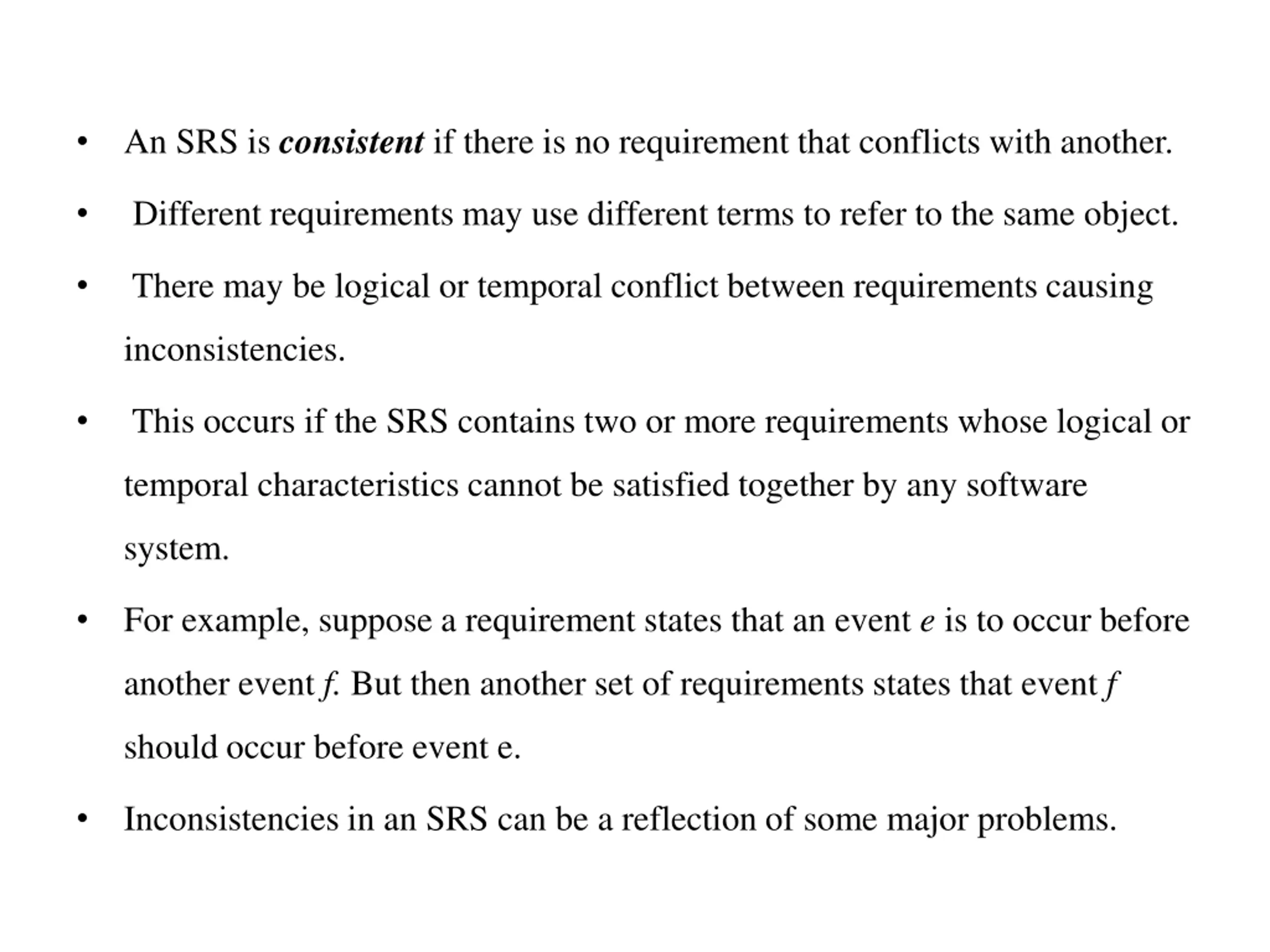 An SRS is consistentif there is no requirement that conflicts with another. Different requirements may use different terms to refer to the same object. There may be logical or temporal conflict between requirements causing inconsistencies. This occurs if the SRS contains two or more requirements whose logical or temporal characteristics cannot be satisfied together by any software system. For example, suppose a requirement states that an event e is to occur before another event f. But then another set of requirements states that event f should occur before event e. Inconsistencies in an SRS can be a reflection of some major problems.