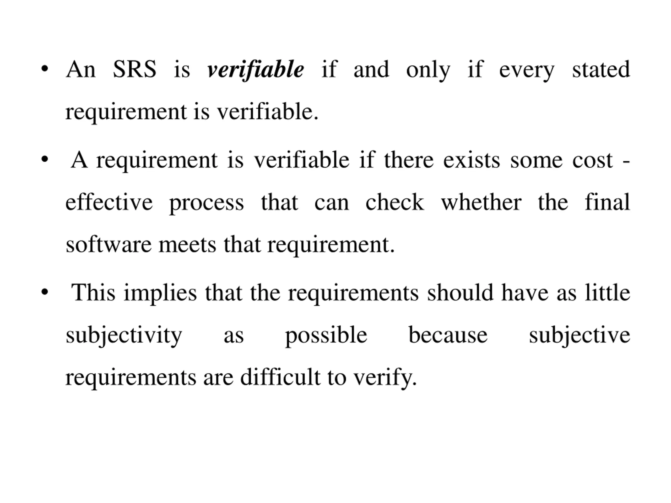 An SRS is verifiableif and only if every stated requirement is verifiable. A requirement is verifiable if there exists some cost - effective process that can check whether the final software meets that requirement. This implies that the requirements should have as little subjectivity as possible because subjective requirements are difficult to verify.