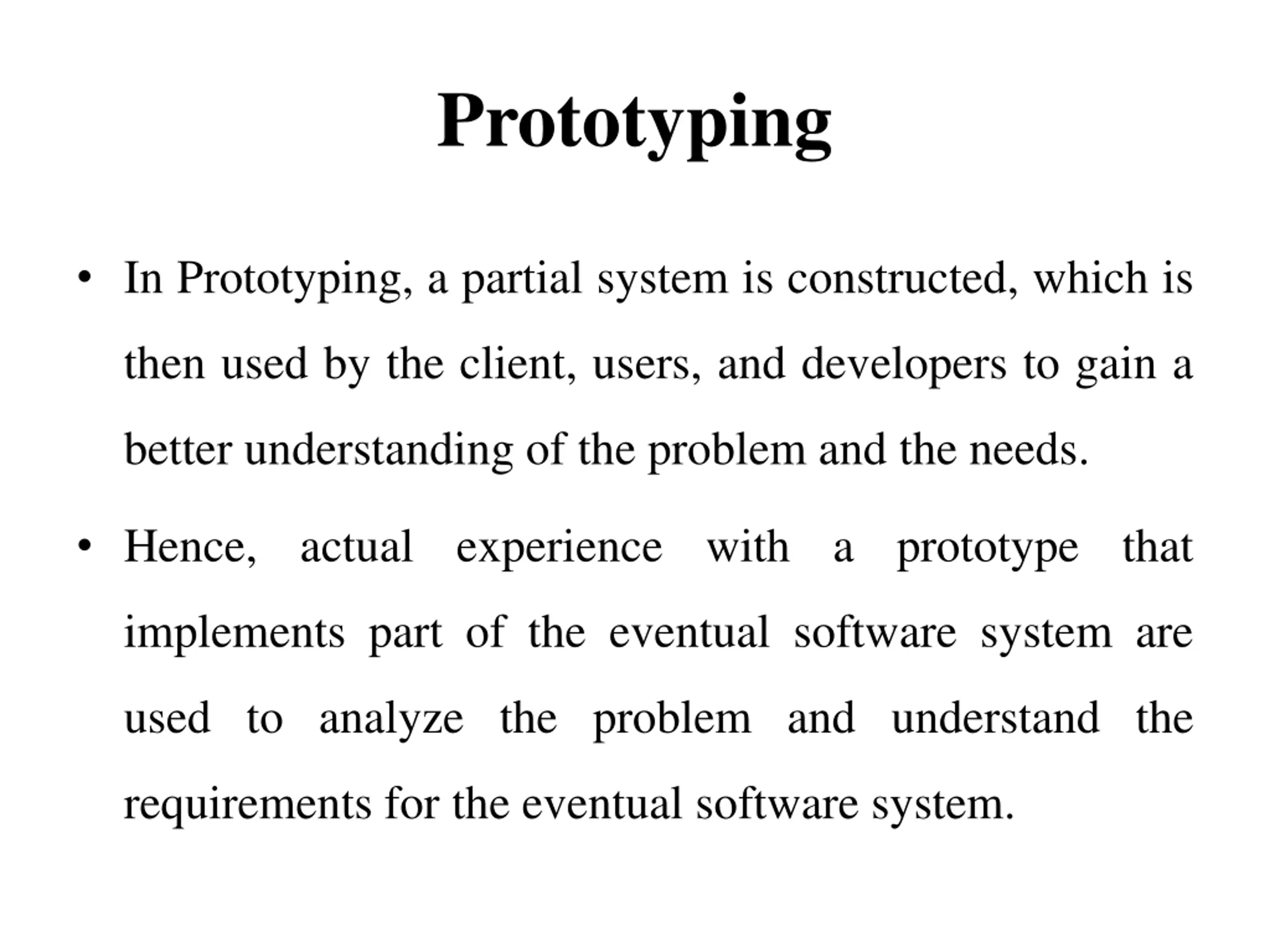 Prototyping In Prototyping, a partial system is constructed, which is then used by the client, users, and developers to gain a better understanding of the problem and the needs. Hence, actual experience with a prototype that implements part of the eventual software system are used to analyze the problem and understand the requirements for the eventual software system.