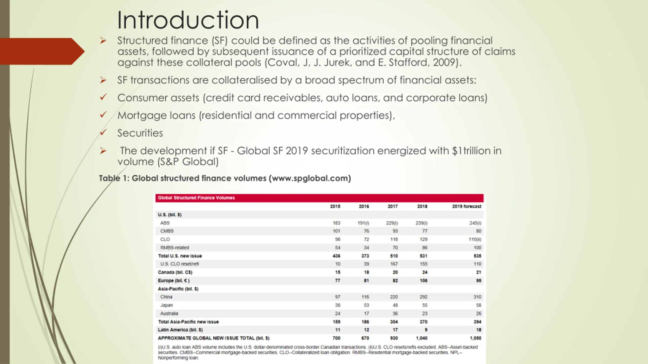 Introduction Structured finance (SF) could be defined as the activities of pooling financial assets, followed by subsequent issuance of a prioritized capital structure of claims against these collateral pools (Coval, J, J. Jurek, and E. Stafford, 2009). SF transactions are collateralised by a broad spectrum of financial assets: Consumer assets (credit card receivables, auto loans, and corporate loans) Mortgage loans (residential and commercial properties), Securities The development if SF - Global SF 2019 securitization energized with $1trillion in volume (S&P Global) Table 1: Global structured finance volumes (www.spglobal.com)