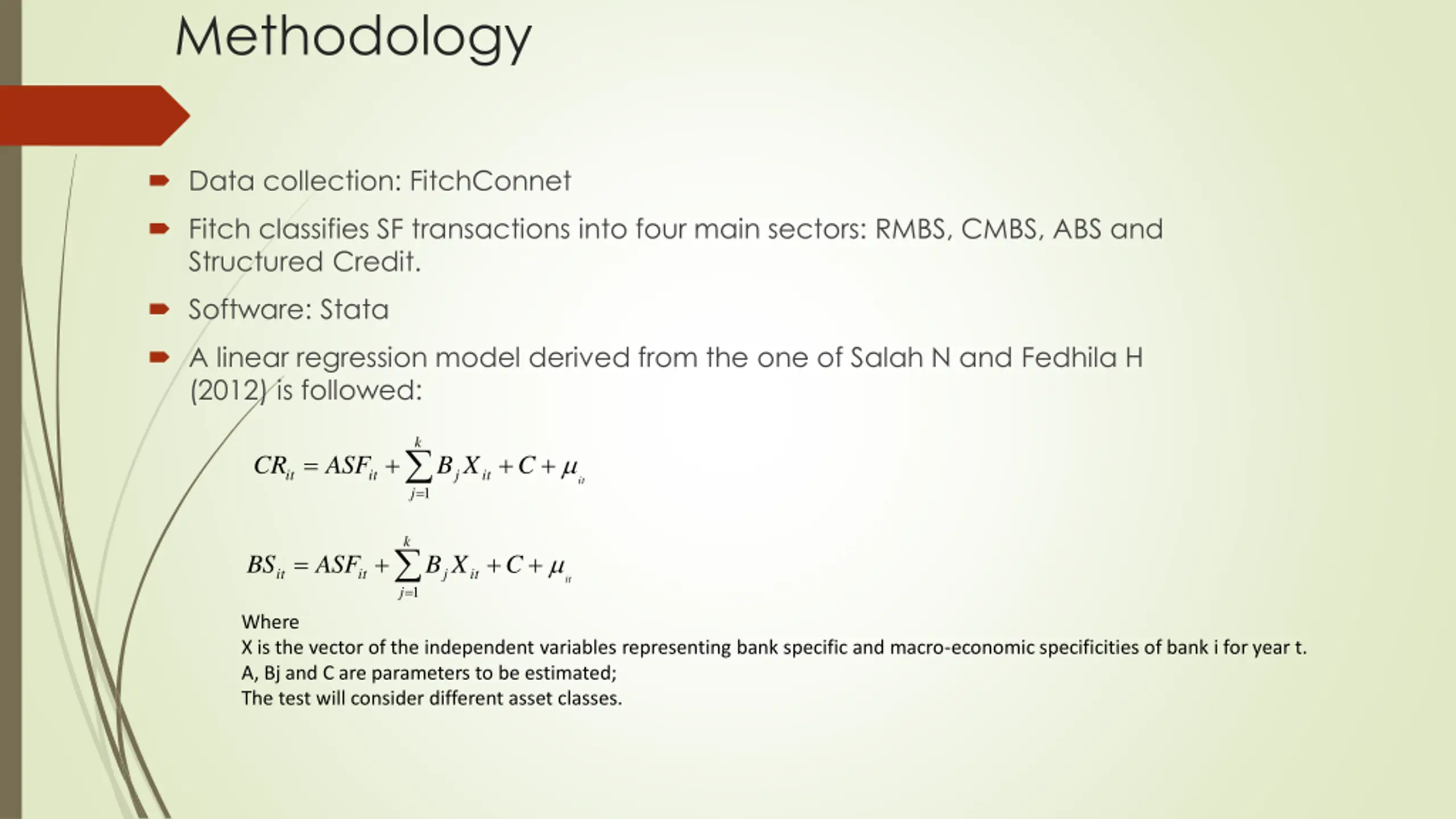Methodology Data collection: FitchConnet Fitch classifies SF transactions into four main sectors: RMBS, CMBS, ABS and Structured Credit. Software: Stata A linear regression model derived from the one of Salah N and Fedhila H (2012) is followed: k =1 = + + + CR ASF B X C it it j it it j k =1 = + + + BS ASF B X C it it j it it j Where X is the vector of the independent variables representing bank specific and macro-economic specificities of bank i for year t. A, Bj and C are parameters to be estimated; The test will consider different asset classes.