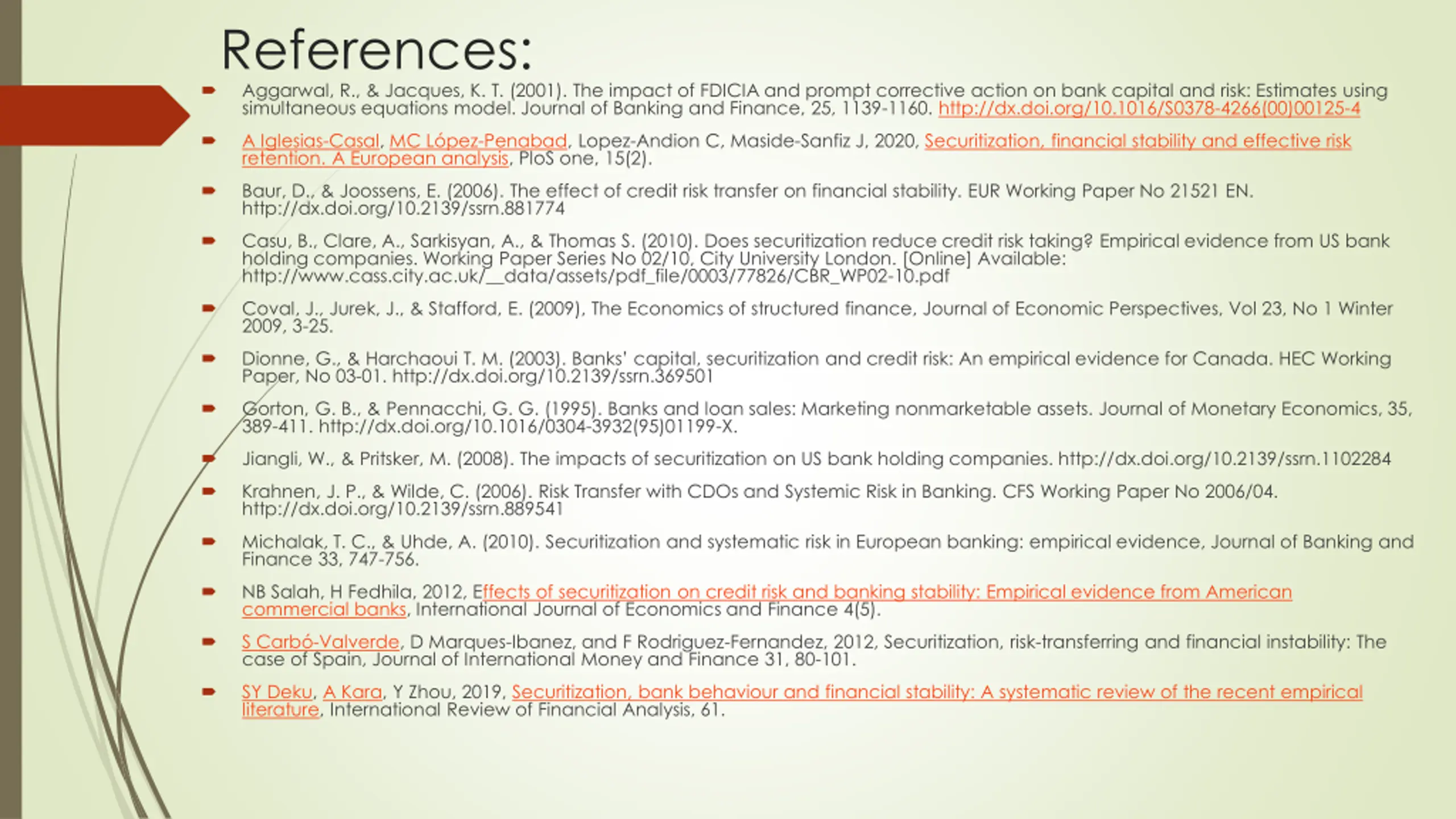 References: Aggarwal, R., & Jacques, K. T. (2001). The impact of FDICIA and prompt corrective action on bank capital and risk: Estimates using simultaneous equations model. Journal of Banking and Finance, 25, 1139-1160. http://dx.doi.org/10.1016/S0378-4266(00)00125-4 A Iglesias-Casal, MC L pez-Penabad, Lopez-Andion C, Maside-Sanfiz J, 2020, Securitization, financial stability and effective risk retention. A European analysis, PloS one, 15(2). Baur, D., & Joossens, E. (2006). The effect of credit risk transfer on financial stability. EUR Working Paper No 21521 EN. http://dx.doi.org/10.2139/ssrn.881774 Casu, B., Clare, A., Sarkisyan, A., & Thomas S. (2010). Does securitization reduce credit risk taking? Empirical evidence from US bank holding companies. Working Paper Series No 02/10, City University London. [Online] Available: http://www.cass.city.ac.uk/__data/assets/pdf_file/0003/77826/CBR_WP02-10.pdf Coval, J., Jurek, J., & Stafford, E. (2009), The Economics of structured finance, Journal of Economic Perspectives, Vol 23, No 1 Winter 2009, 3-25. Dionne, G., & Harchaoui T. M. (2003). Banks capital, securitization and credit risk: An empirical evidence for Canada. HEC Working Paper, No 03-01. http://dx.doi.org/10.2139/ssrn.369501 Gorton, G. B., & Pennacchi, G. G. (1995). Banks and loan sales: Marketing nonmarketable assets. Journal of Monetary Economics, 35, 389-411. http://dx.doi.org/10.1016/0304-3932(95)01199-X. Jiangli, W., & Pritsker, M. (2008). The impacts of securitization on US bank holding companies. http://dx.doi.org/10.2139/ssrn.1102284 Krahnen, J. P., & Wilde, C. (2006). Risk Transfer with CDOs and Systemic Risk in Banking. CFS Working Paper No 2006/04. http://dx.doi.org/10.2139/ssrn.889541 Michalak, T. C., & Uhde, A. (2010). Securitization and systematic risk in European banking: empirical evidence, Journal of Banking and Finance 33, 747-756. NB Salah, H Fedhila, 2012, Effects of securitization on credit risk and banking stability: Empirical evidence from American commercial banks, International Journal of Economics and Finance 4(5). S Carb -Valverde, D Marques-Ibanez, and F Rodriguez-Fernandez, 2012, Securitization, risk-transferring and financial instability: The case of Spain, Journal of International Money and Finance 31, 80-101. SY Deku, A Kara, Y Zhou, 2019, Securitization, bank behaviour and financial stability: A systematic review of the recent empirical literature, International Review of Financial Analysis, 61.
