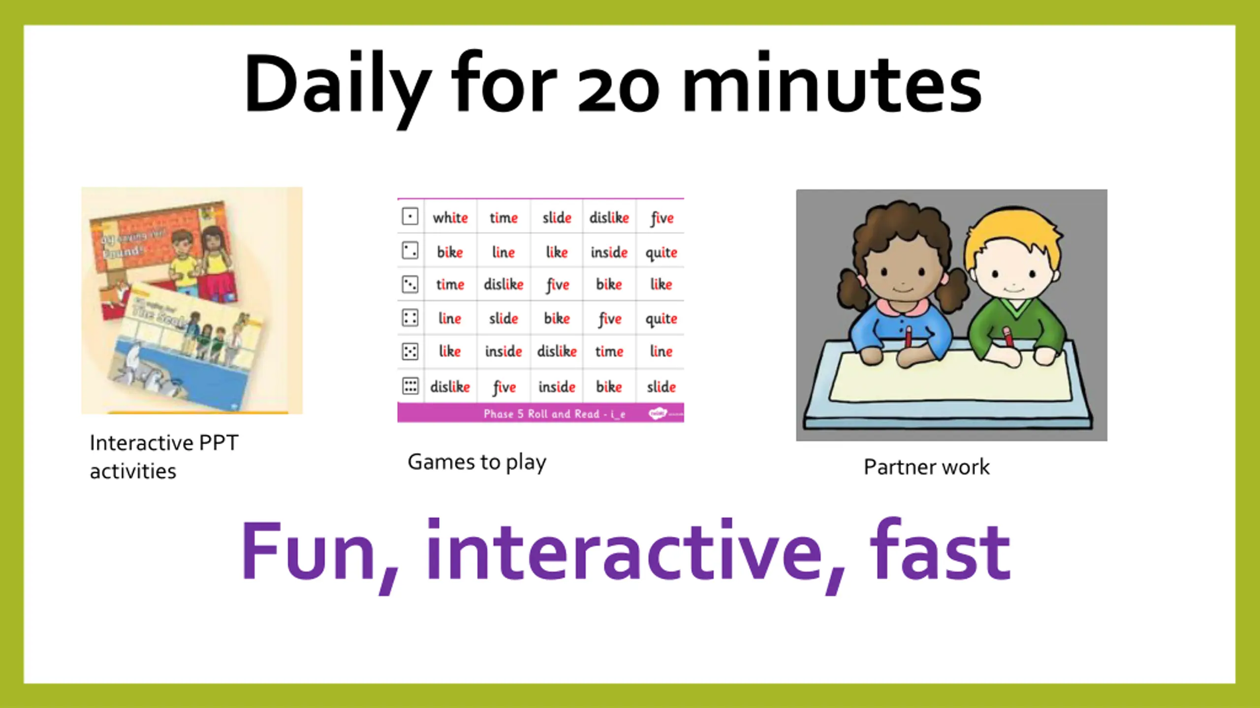 Daily for 20 minutes Interactive PPT activities Games to play Partner work Fun, interactive, fast