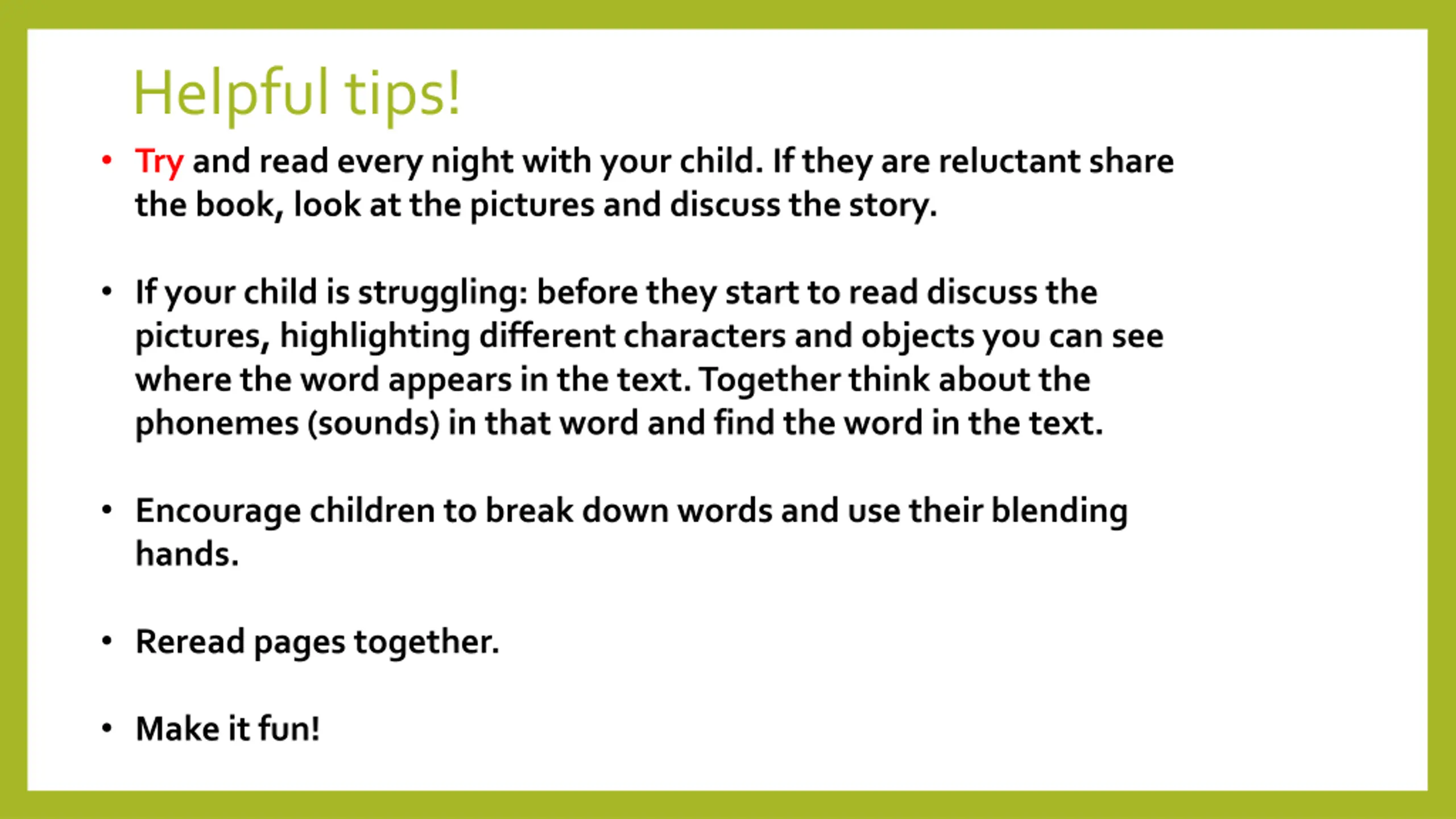 Helpful tips! Try and read every night with your child. If they are reluctant share the book, look at the pictures and discuss the story. If your child is struggling: before they start to read discuss the pictures, highlighting different characters and objects you can see where the word appears in the text. Together think about the phonemes (sounds) in that word and find the word in the text. Encourage children to break down words and use their blending hands. Reread pages together. Make it fun!