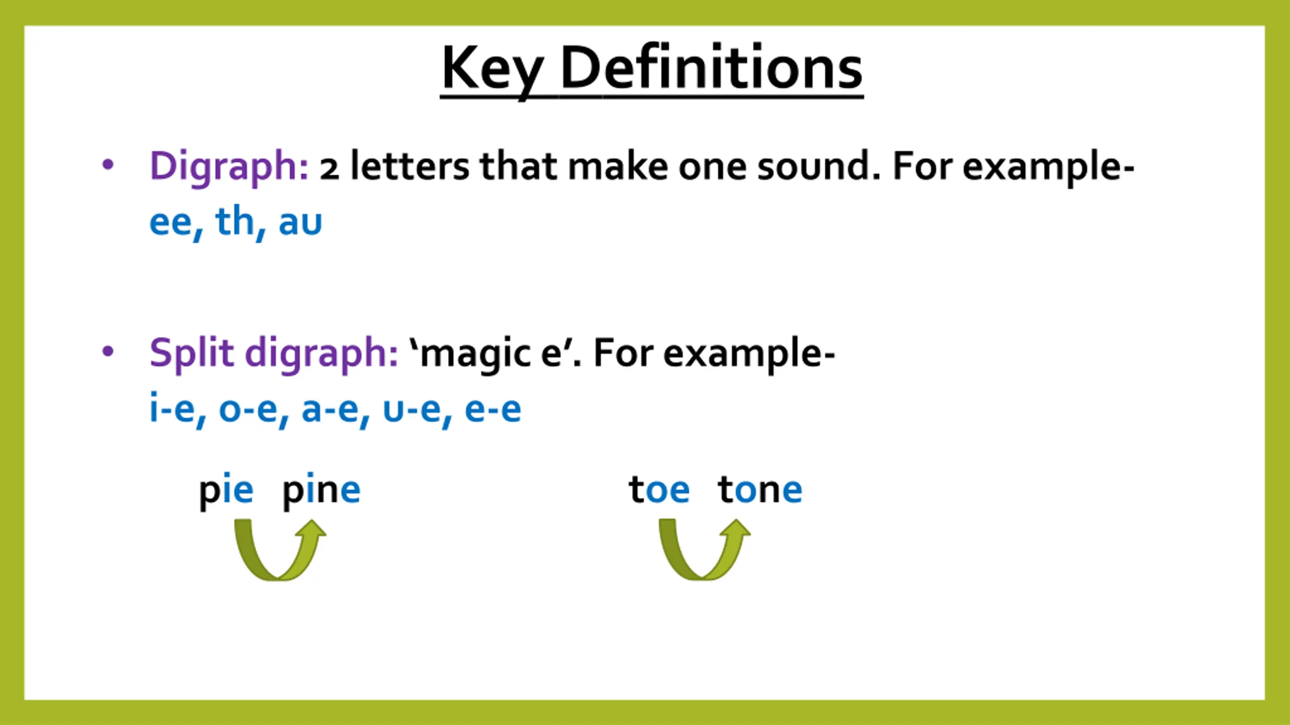 Key Definitions Digraph: 2 letters that make one sound. For example- ee, th, au Split digraph: magic e . For example- i-e, o-e, a-e, u-e, e-e pie pine toe tone
