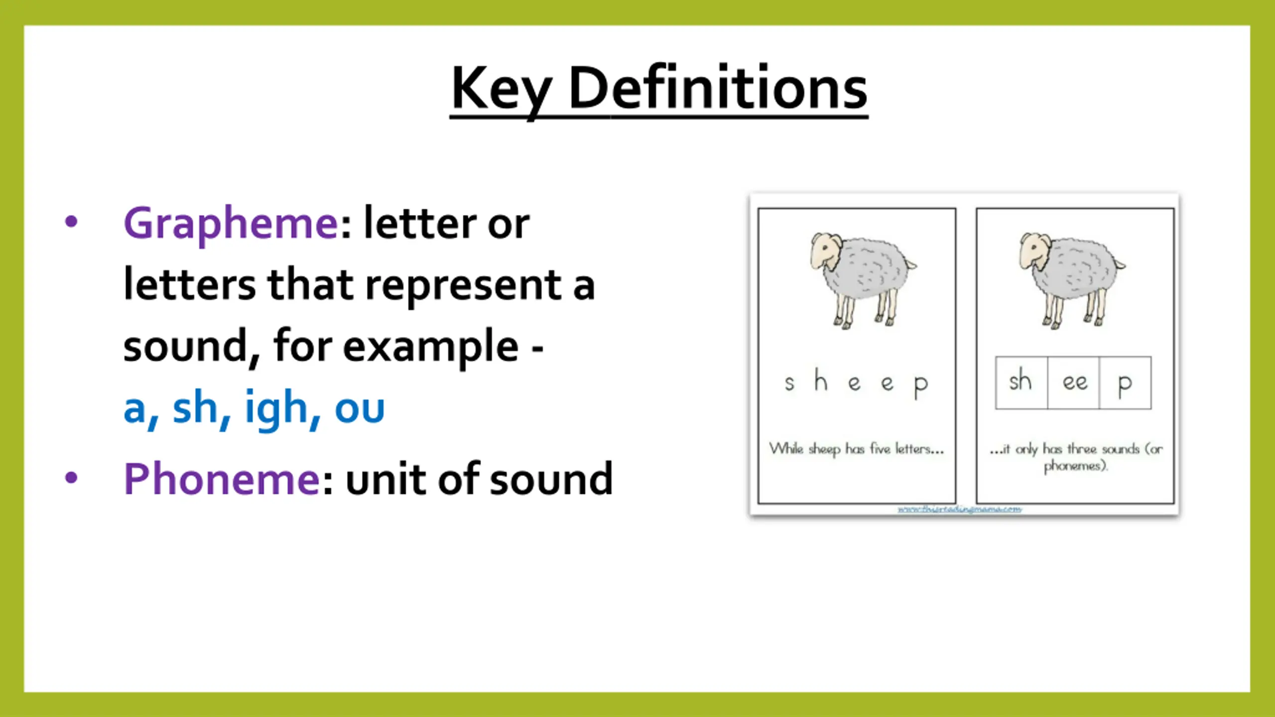 Key Definitions Grapheme: letter or letters that represent a sound, for example - a, sh, igh, ou Phoneme: unit of sound