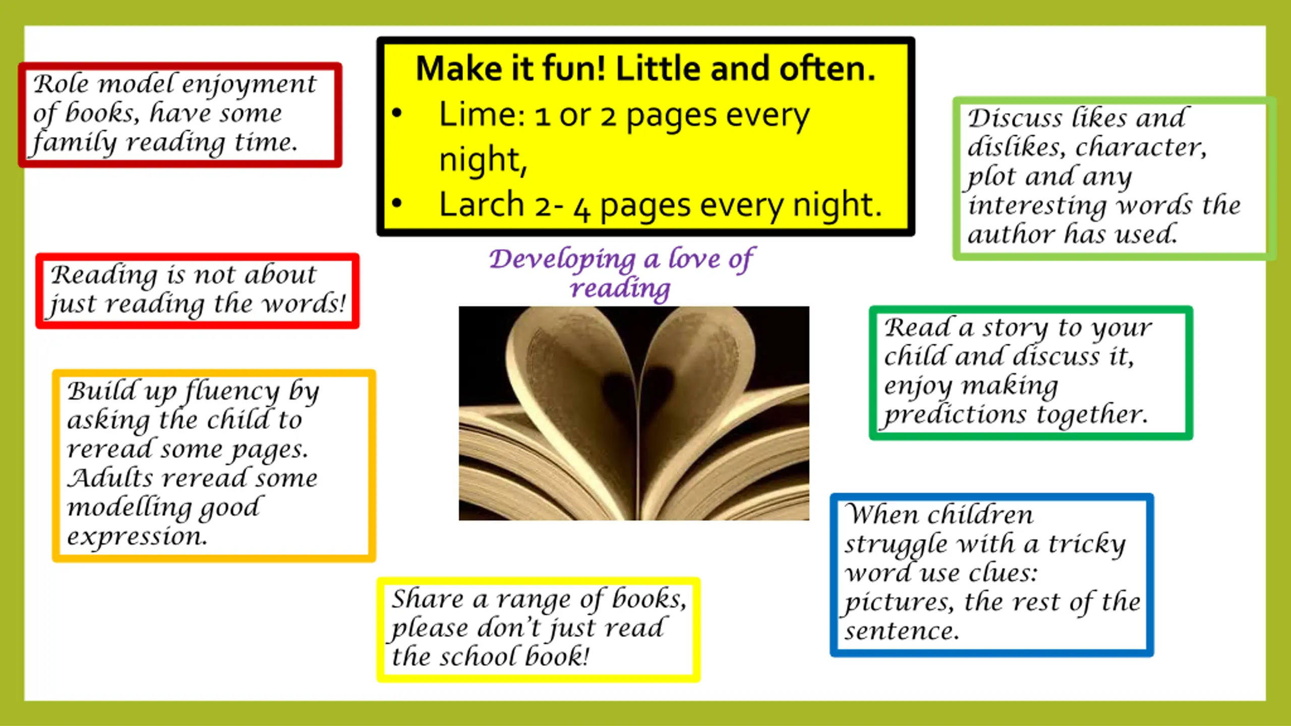 Make it fun! Little and often. Lime: 1 or 2 pages every night, Larch 2- 4 pages every night. Role model enjoyment of books, have some family reading time. Discuss likes and dislikes, character, plot and any interesting words the author has used. Developing a love of Developing a love of reading reading Reading is not about just reading the words! Read a story to your child and discuss it, enjoy making predictions together. Build up fluency by asking the child to reread some pages. Adults reread some modelling good expression. When children struggle with a tricky word use clues: pictures, the rest of the sentence. Share a range of books, please don t just read the school book!