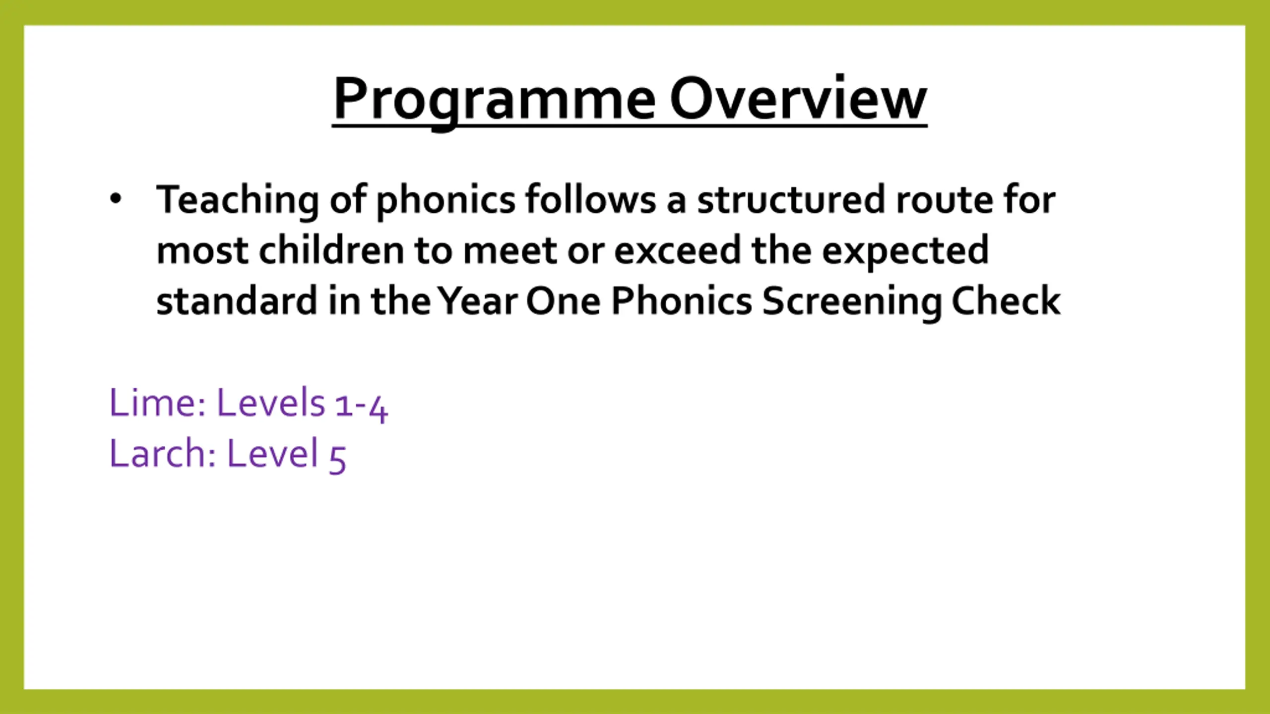 Programme Overview Teaching of phonics follows a structured route for most children to meet or exceed the expected standard in the Year One Phonics Screening Check Lime: Levels 1-4 Larch: Level 5