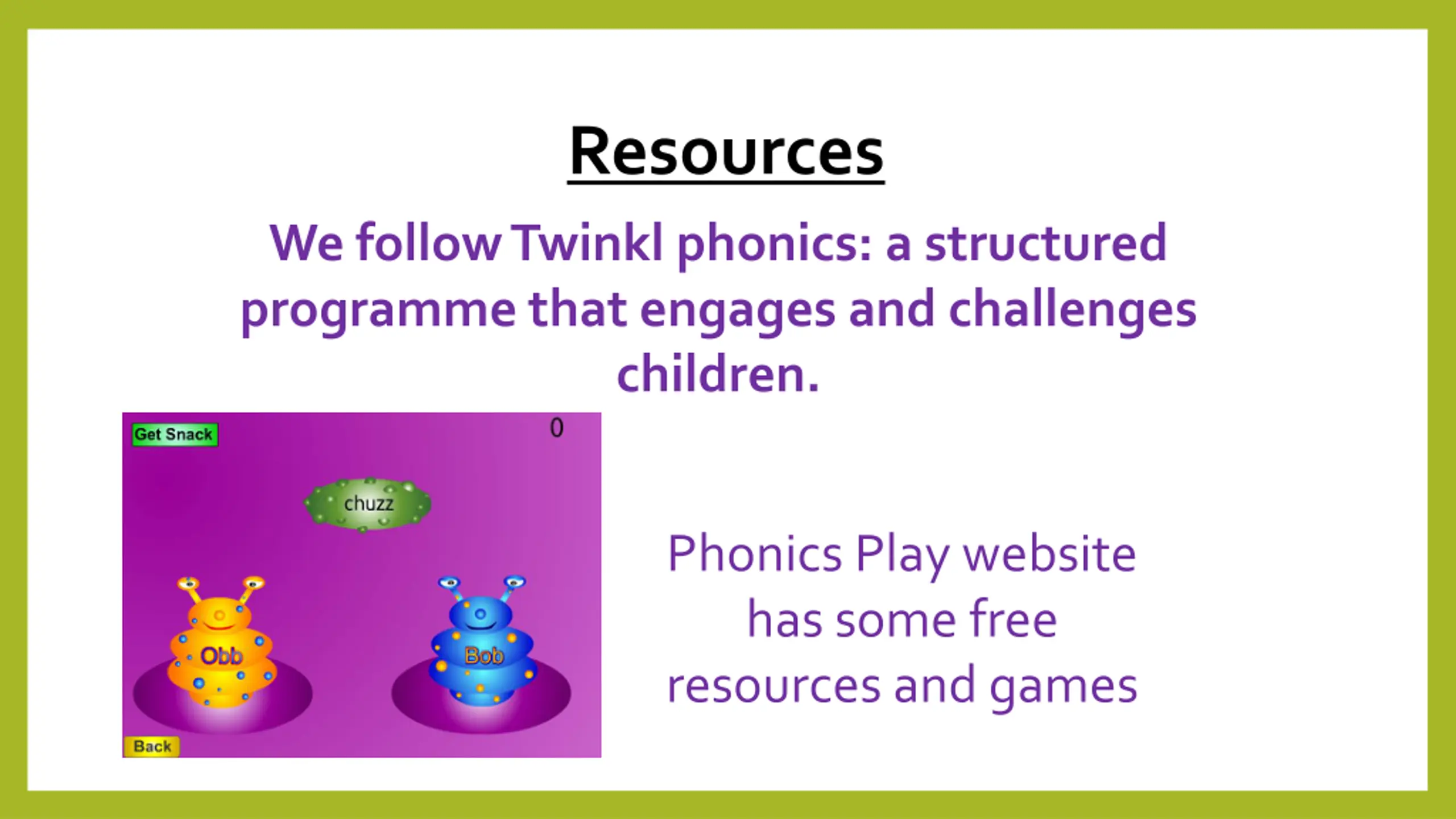 Resources We follow Twinkl phonics: a structured programme that engages and challenges children. Phonics Play website has some free resources and games