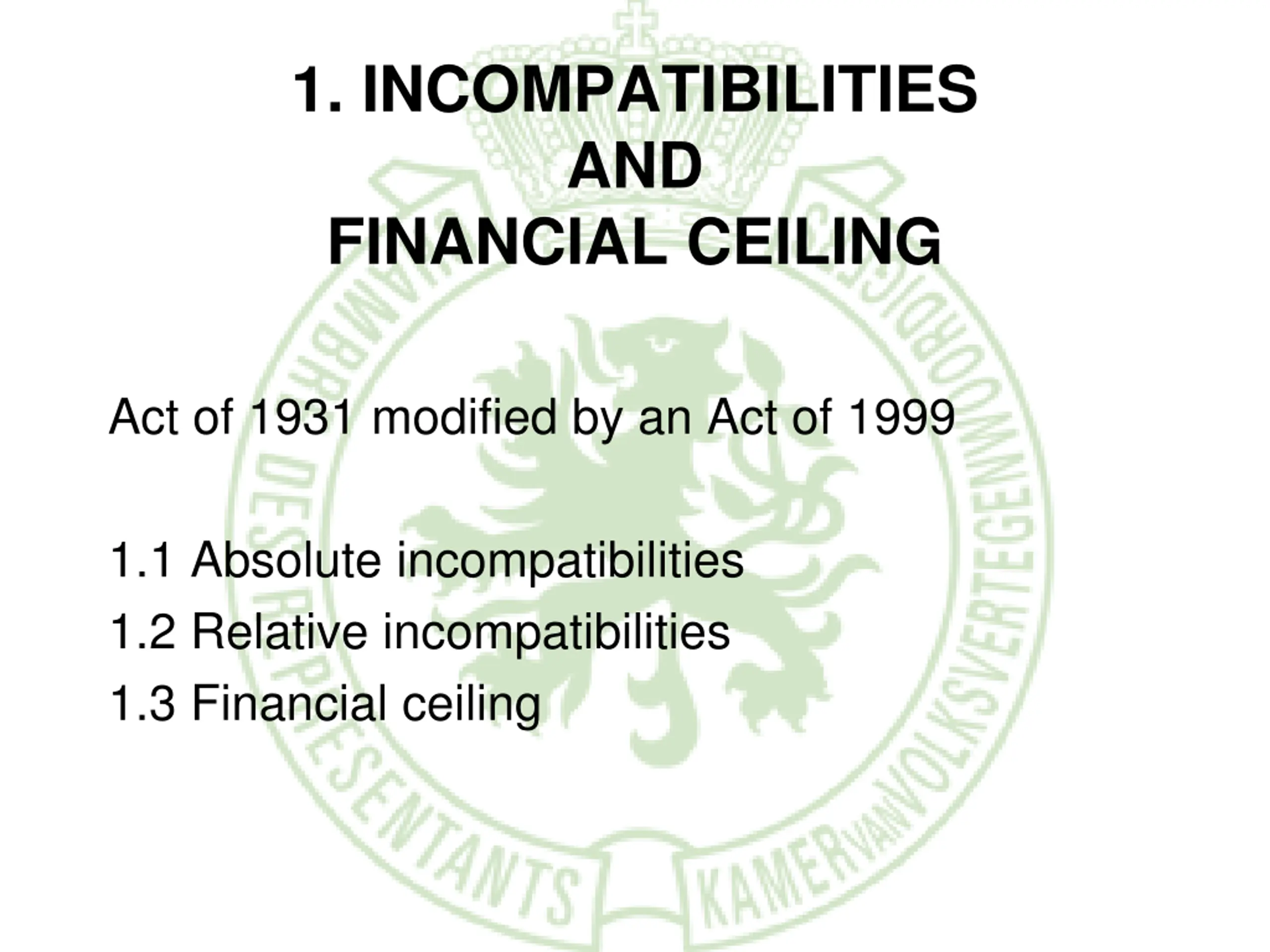 1. INCOMPATIBILITIES AND FINANCIAL CEILING Act of 1931 modified by an Act of 1999 1.1 Absolute incompatibilities 1.2 Relative incompatibilities 1.3 Financial ceiling