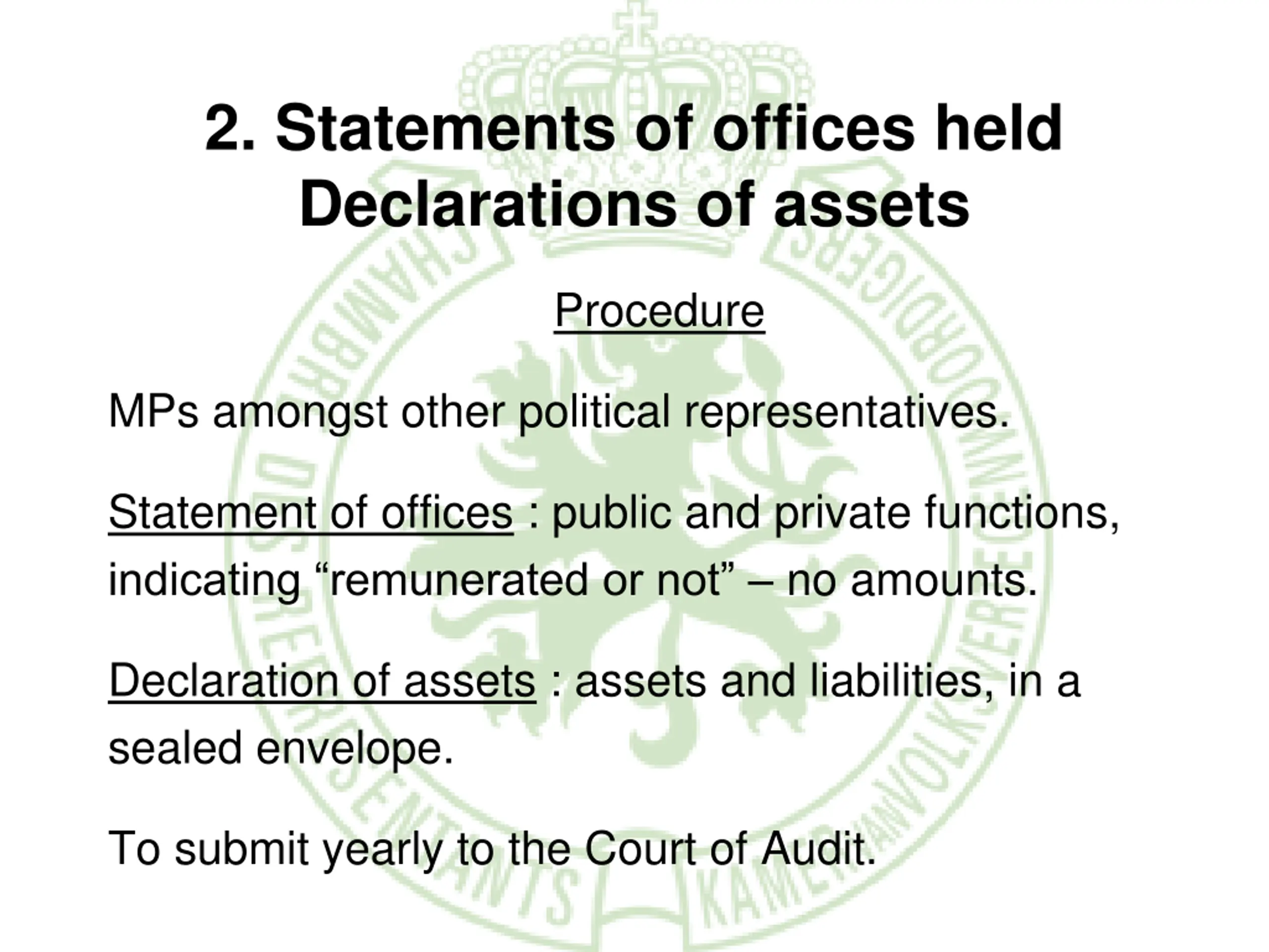 2. Statements of offices held Declarations of assets Procedure MPs amongst other political representatives. Statement of offices : public and private functions, indicating remunerated or not no amounts. Declaration of assets : assets and liabilities, in a sealed envelope. To submit yearly to the Court of Audit.