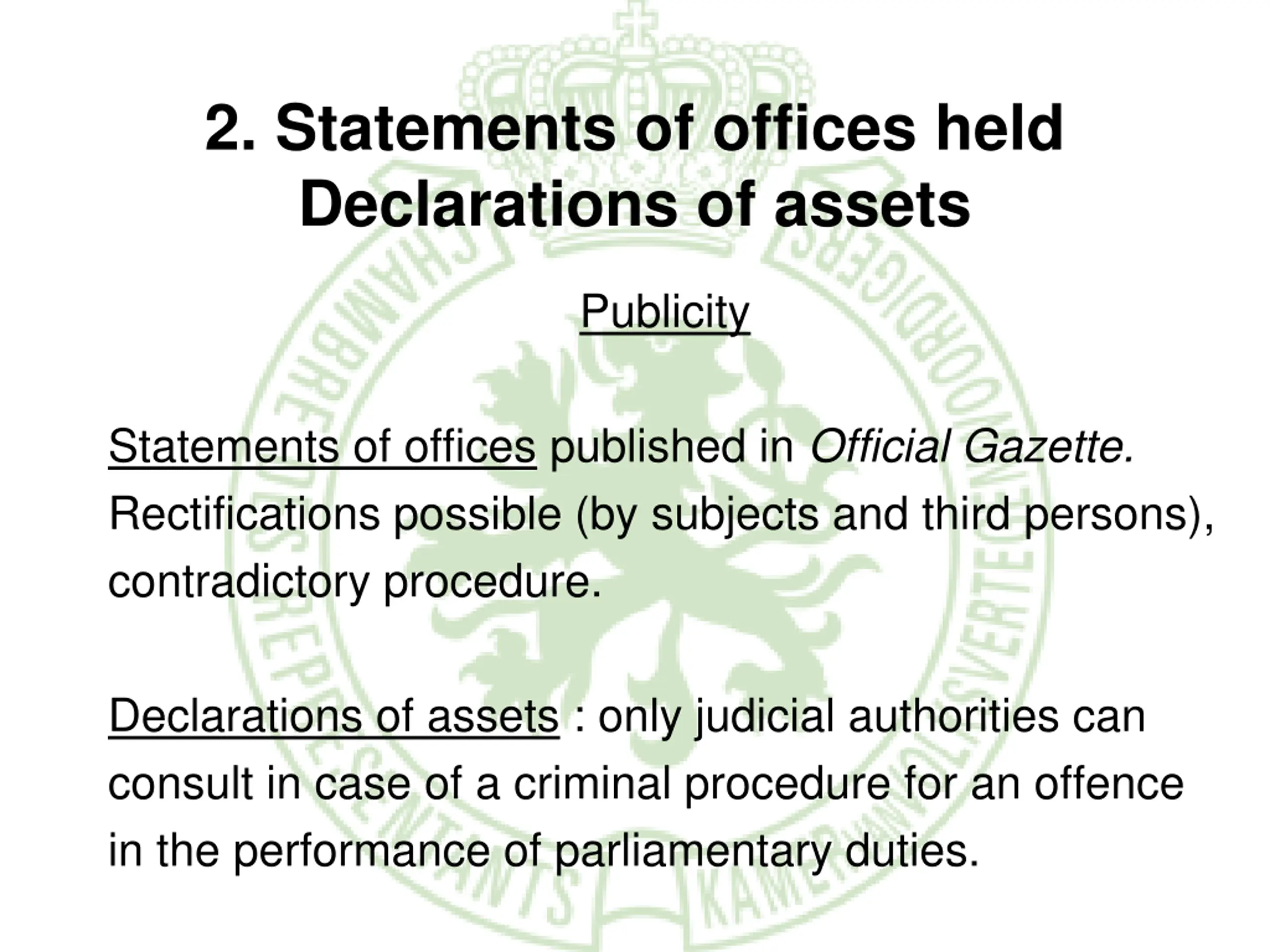 2. Statements of offices held Declarations of assets Publicity Statements of offices published in Official Gazette. Rectifications possible (by subjects and third persons), contradictory procedure. Declarations of assets : only judicial authorities can consult in case of a criminal procedure for an offence in the performance of parliamentary duties.