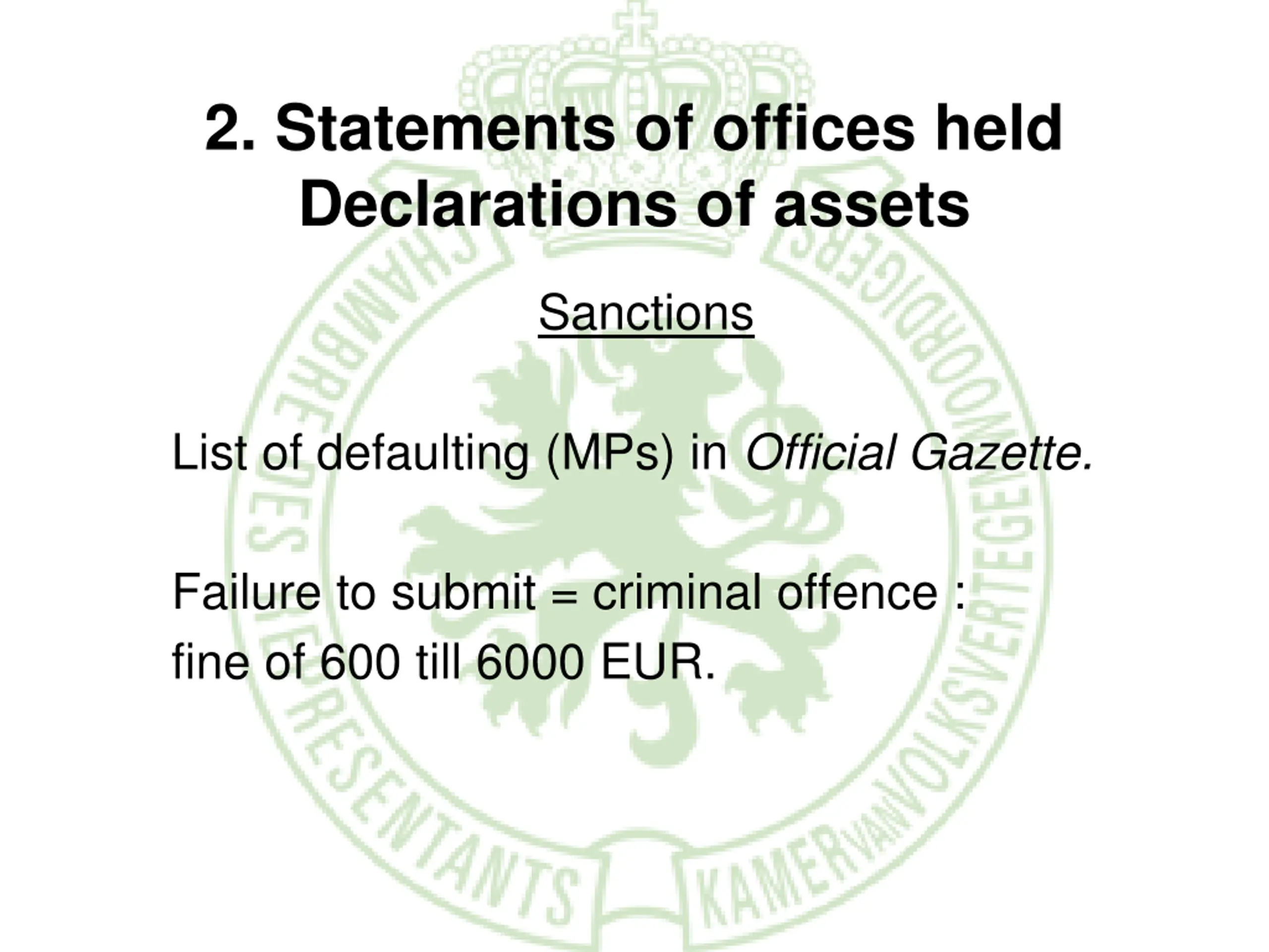 2. Statements of offices held Declarations of assets Sanctions List of defaulting (MPs) in Official Gazette. Failure to submit = criminal offence : fine of 600 till 6000 EUR.