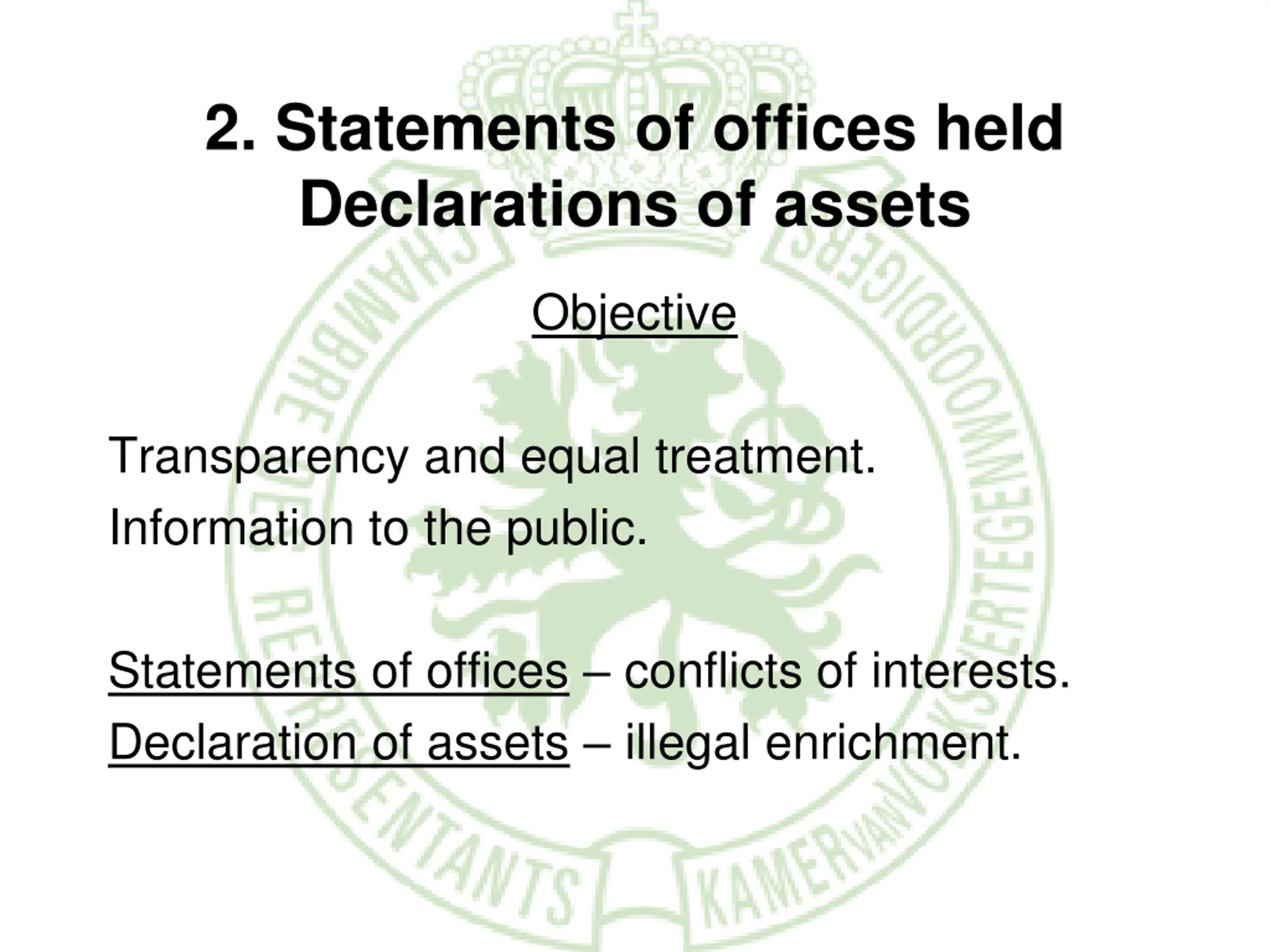 2. Statements of offices held Declarations of assets Objective Transparency and equal treatment. Information to the public. Statements of offices conflicts of interests. Declaration of assets illegal enrichment.