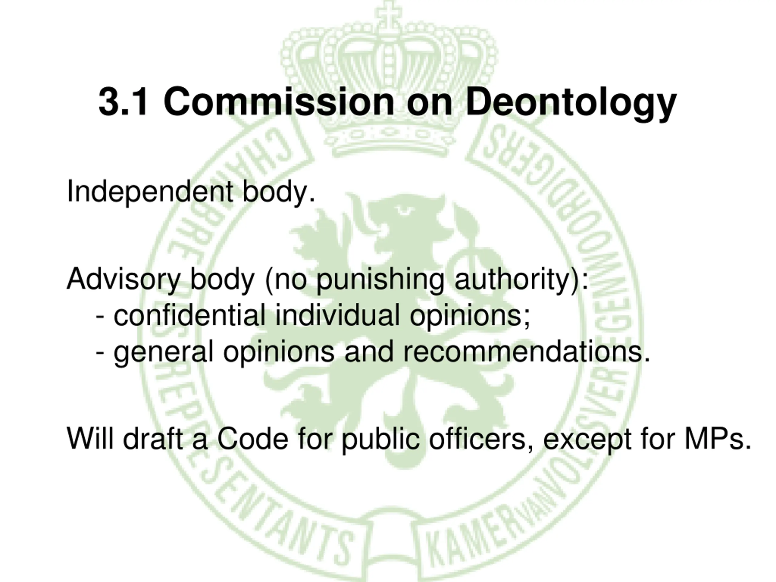 3.1 Commission on Deontology Independent body. Advisory body (no punishing authority): - confidential individual opinions; - general opinions and recommendations. Will draft a Code for public officers, except for MPs.