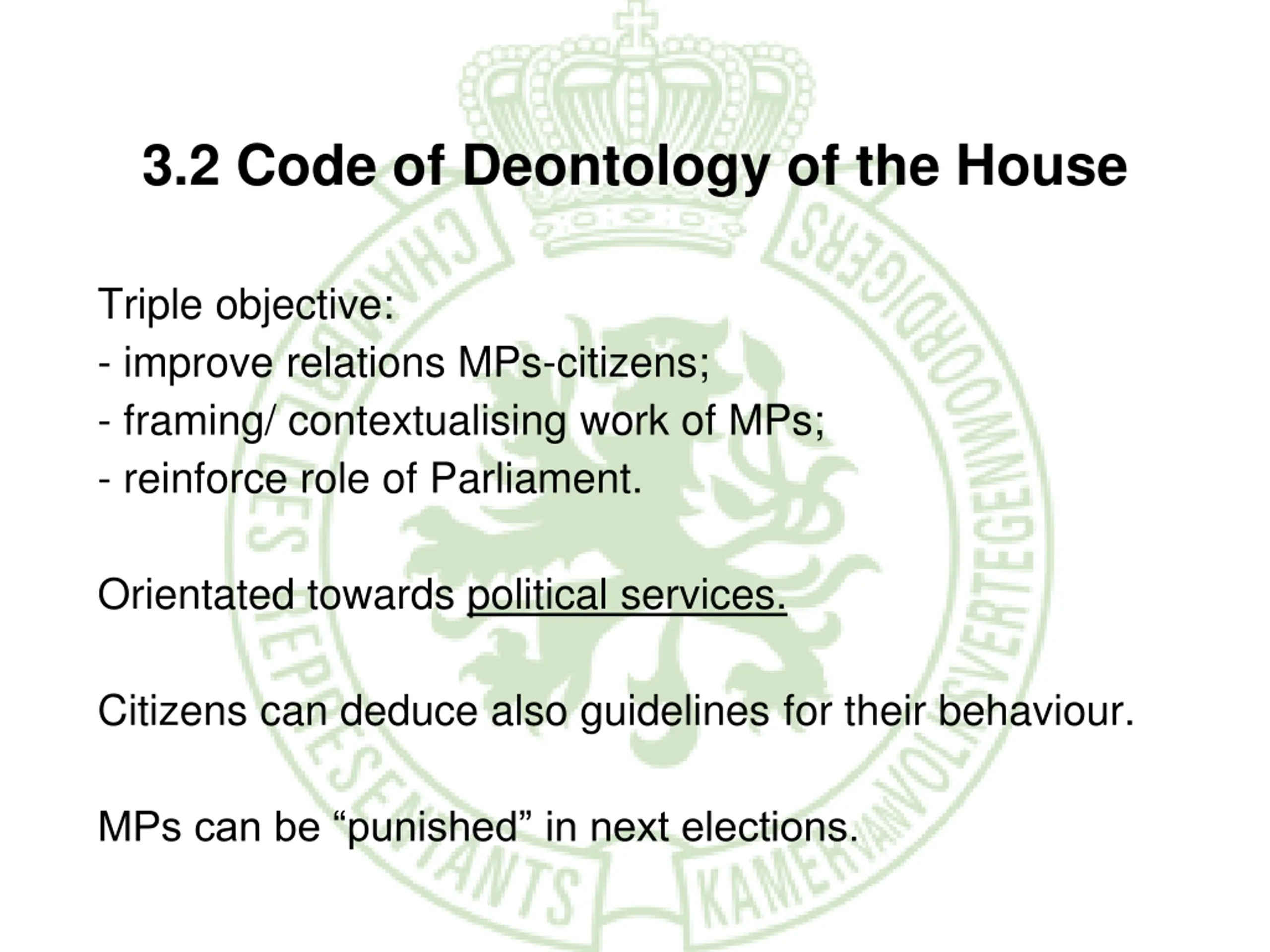 3.2 Code of Deontology of the House Triple objective: - improve relations MPs-citizens; - framing/ contextualising work of MPs; - reinforce role of Parliament. Orientated towards political services. Citizens can deduce also guidelines for their behaviour. MPs can be punished in next elections.