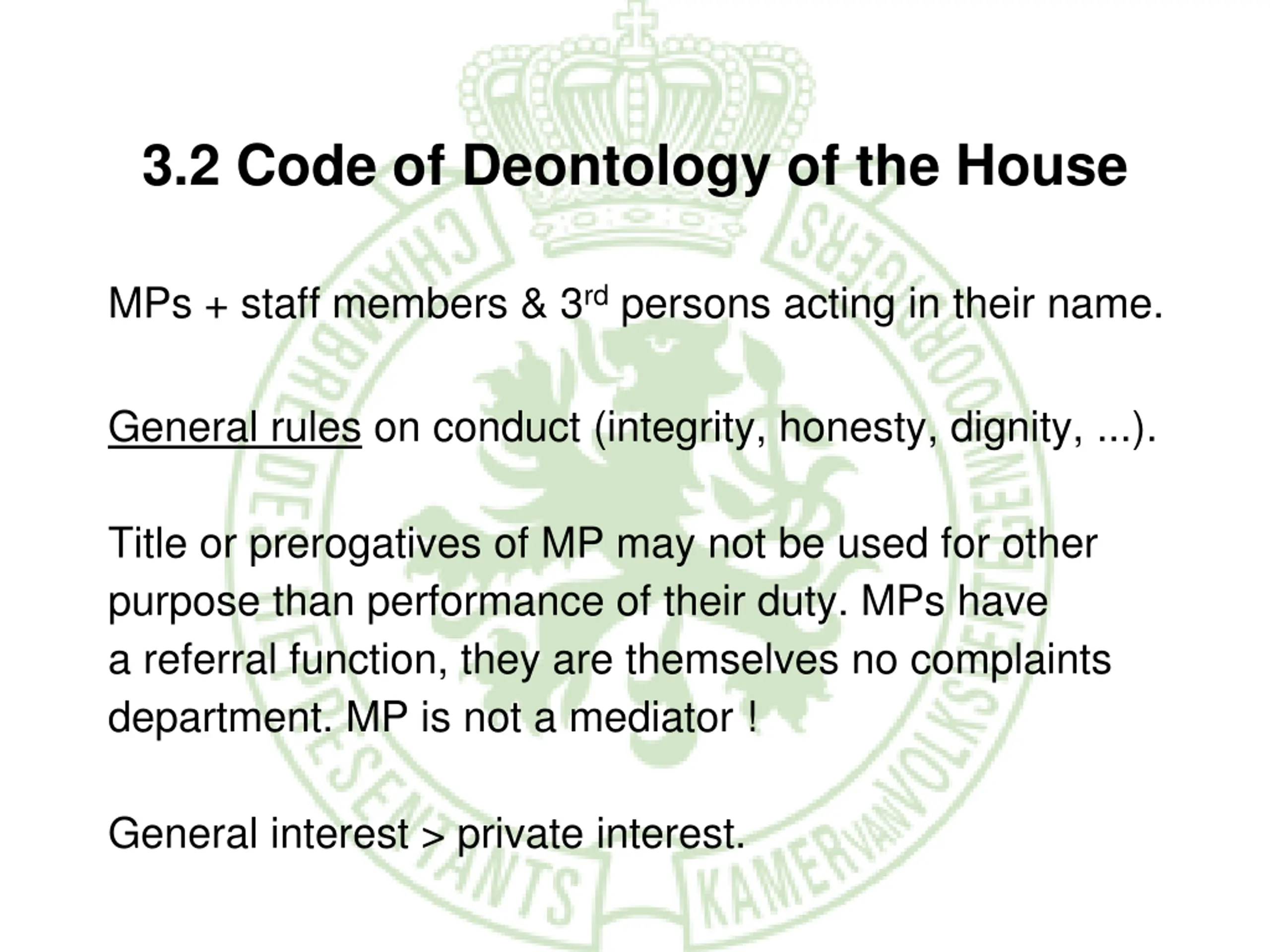 3.2 Code of Deontology of the House MPs + staff members & 3rd persons acting in their name. General rules on conduct (integrity, honesty, dignity, ...). Title or prerogatives of MP may not be used for other purpose than performance of their duty. MPs have a referral function, they are themselves no complaints department. MP is not a mediator ! General interest > private interest.
