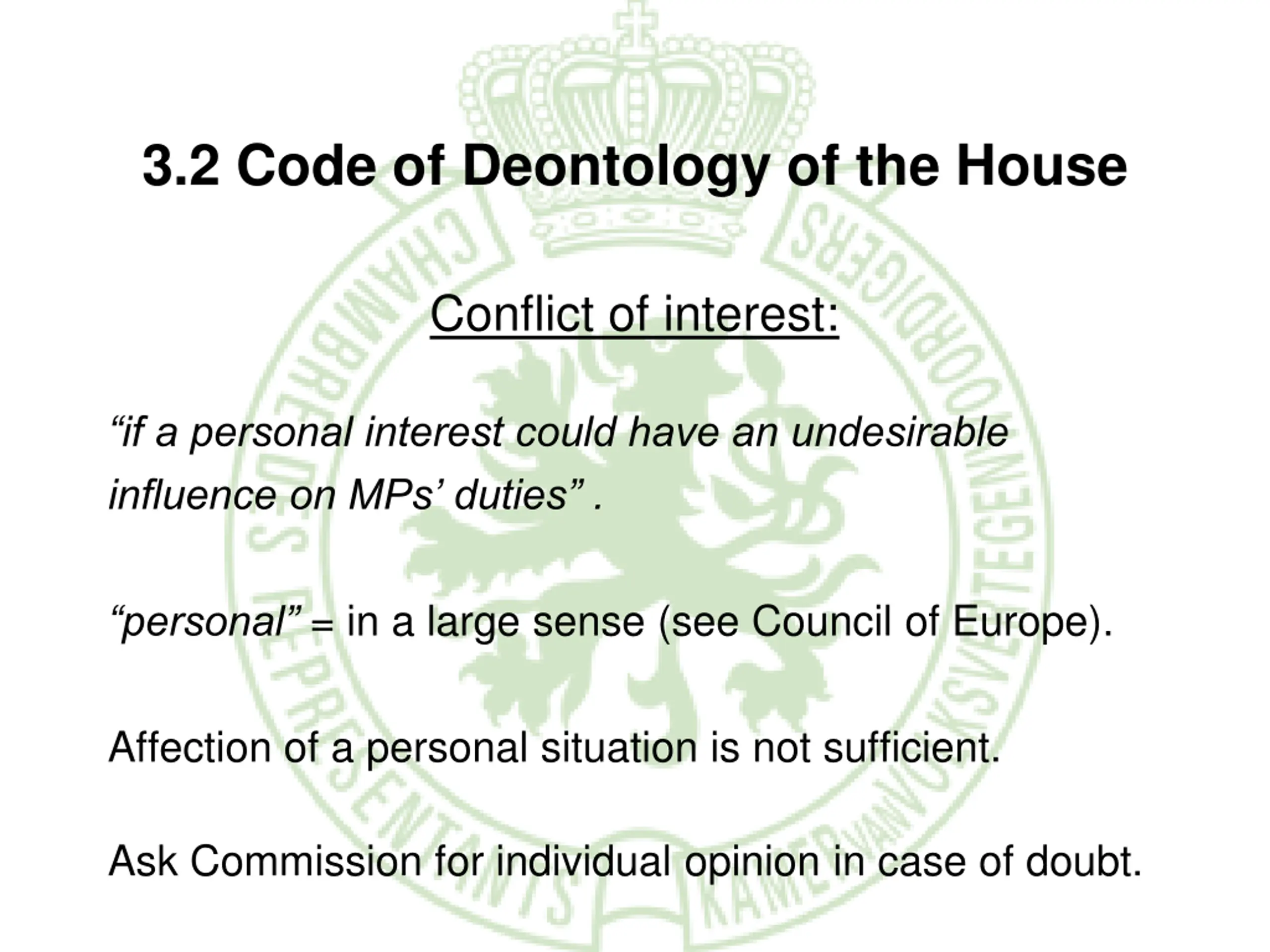 3.2 Code of Deontology of the House Conflict of interest: if a personal interest could have an undesirable influence on MPs duties . personal = in a large sense (see Council of Europe). Affection of a personal situation is not sufficient. Ask Commission for individual opinion in case of doubt.