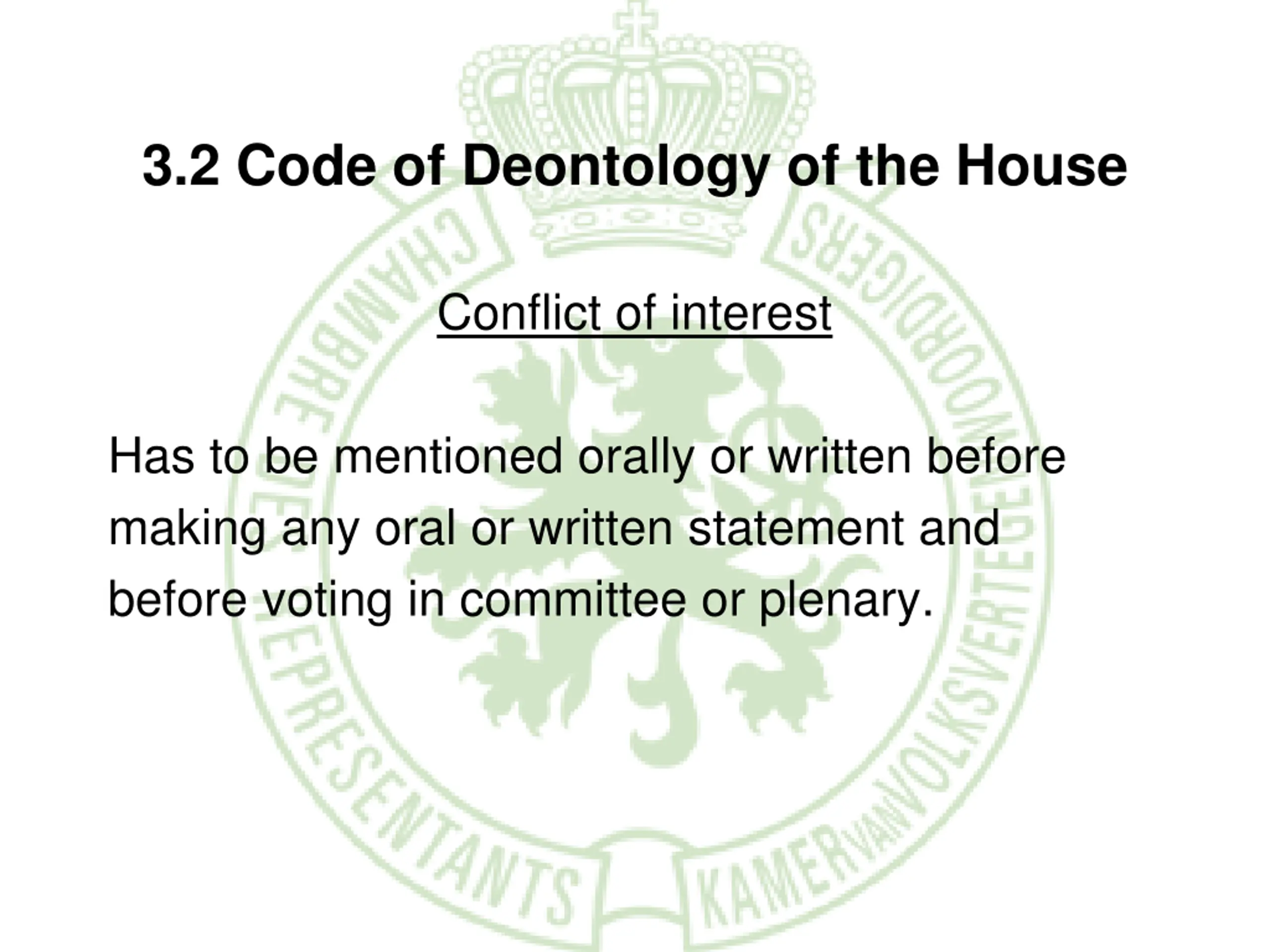 3.2 Code of Deontology of the House Conflict of interest Has to be mentioned orally or written before making any oral or written statement and before voting in committee or plenary.