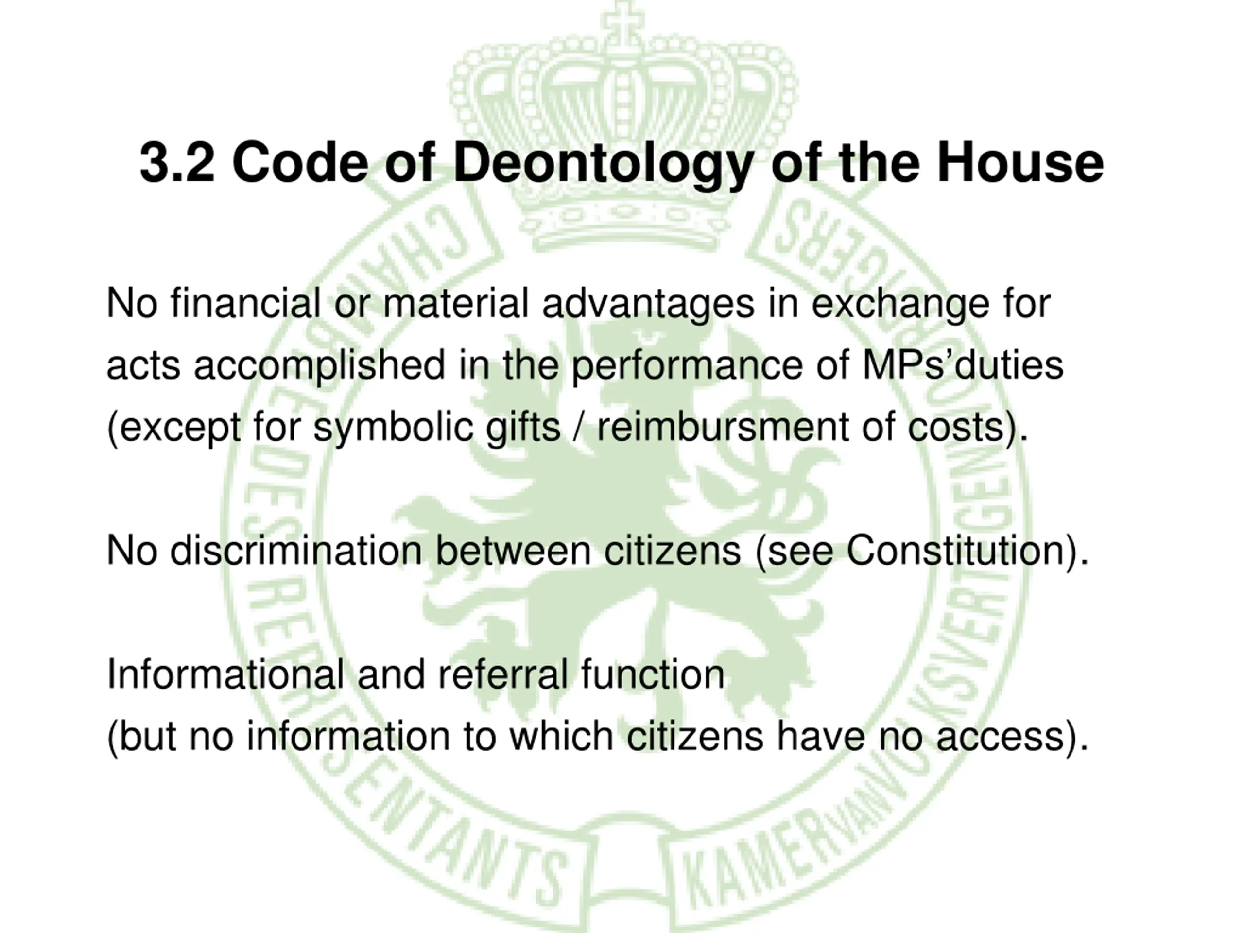 3.2 Code of Deontology of the House No financial or material advantages in exchange for acts accomplished in the performance of MPs duties (except for symbolic gifts / reimbursment of costs). No discrimination between citizens (see Constitution). Informational and referral function (but no information to which citizens have no access).