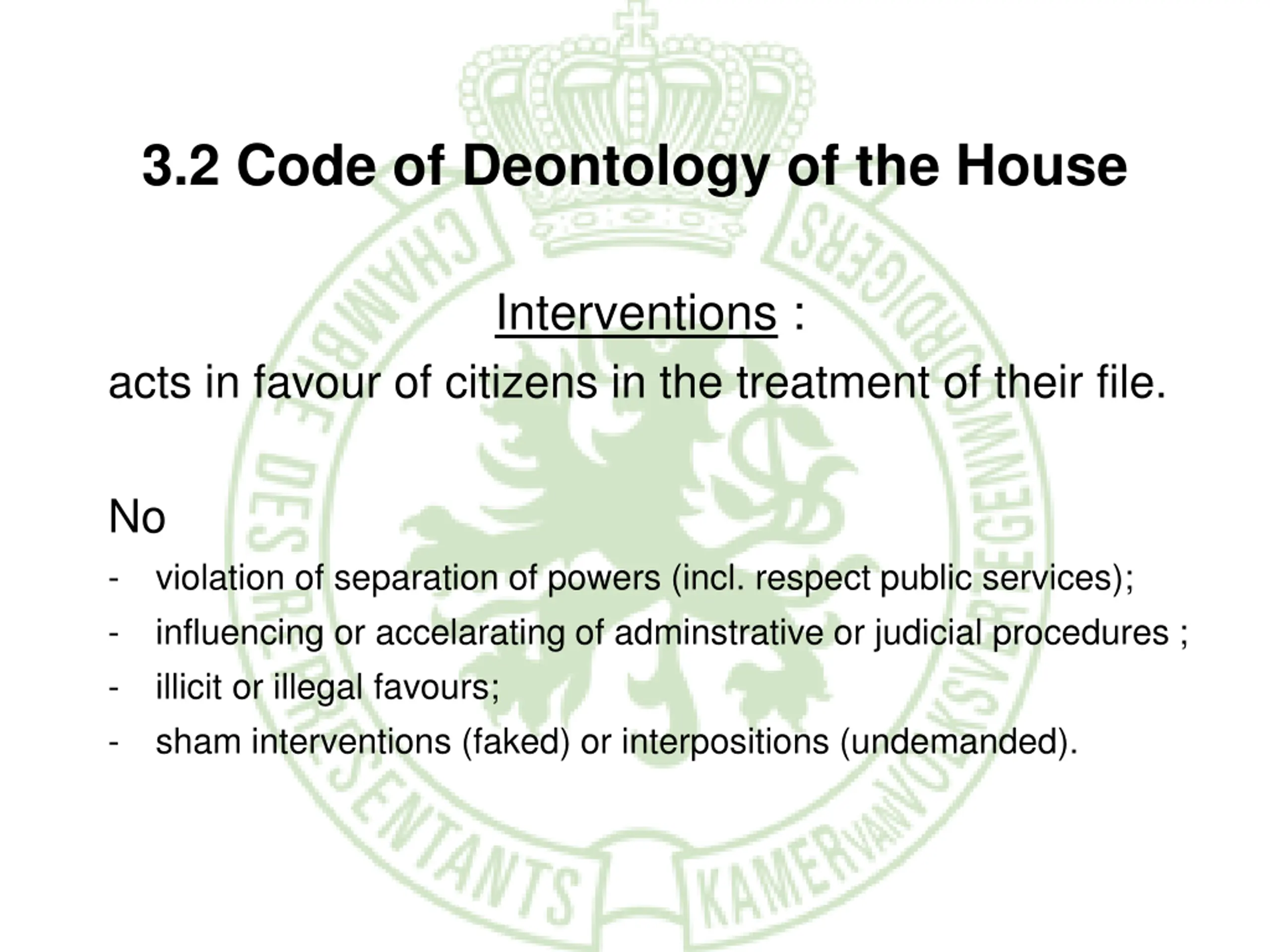 3.2 Code of Deontology of the House Interventions : acts in favour of citizens in the treatment of their file. No - - - - violation of separation of powers (incl. respect public services); influencing or accelarating of adminstrative or judicial procedures ; illicit or illegal favours; sham interventions (faked) or interpositions (undemanded).