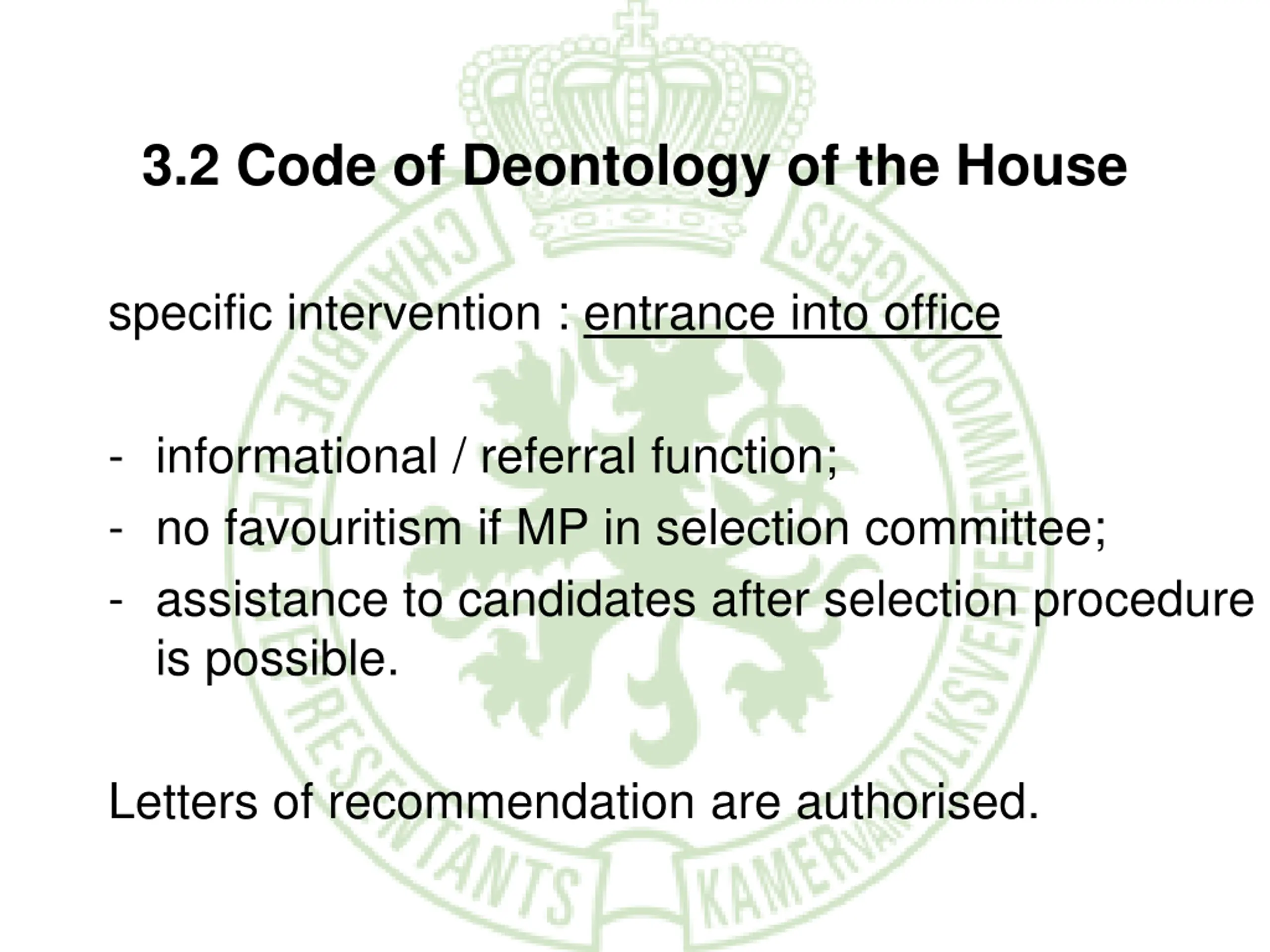 3.2 Code of Deontology of the House specific intervention : entrance into office - informational / referral function; - no favouritism if MP in selection committee; - assistance to candidates after selection procedure is possible. Letters of recommendation are authorised.
