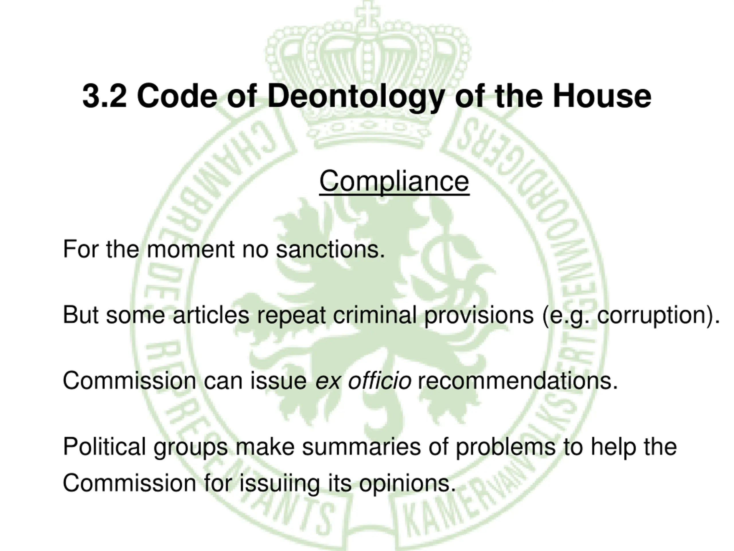 3.2 Code of Deontology of the House Compliance For the moment no sanctions. But some articles repeat criminal provisions (e.g. corruption). Commission can issue ex officio recommendations. Political groups make summaries of problems to help the Commission for issuiing its opinions.