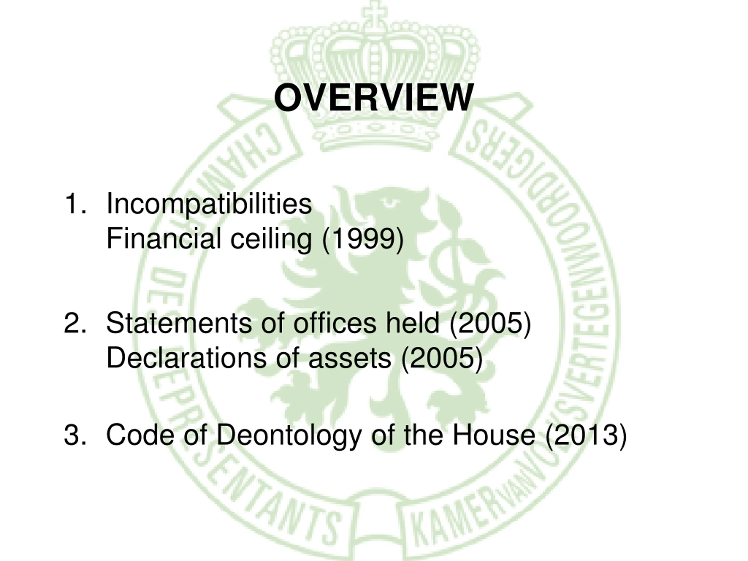 OVERVIEW 1. Incompatibilities Financial ceiling (1999) 2. Statements of offices held (2005) Declarations of assets (2005) 3. Code of Deontology of the House (2013)