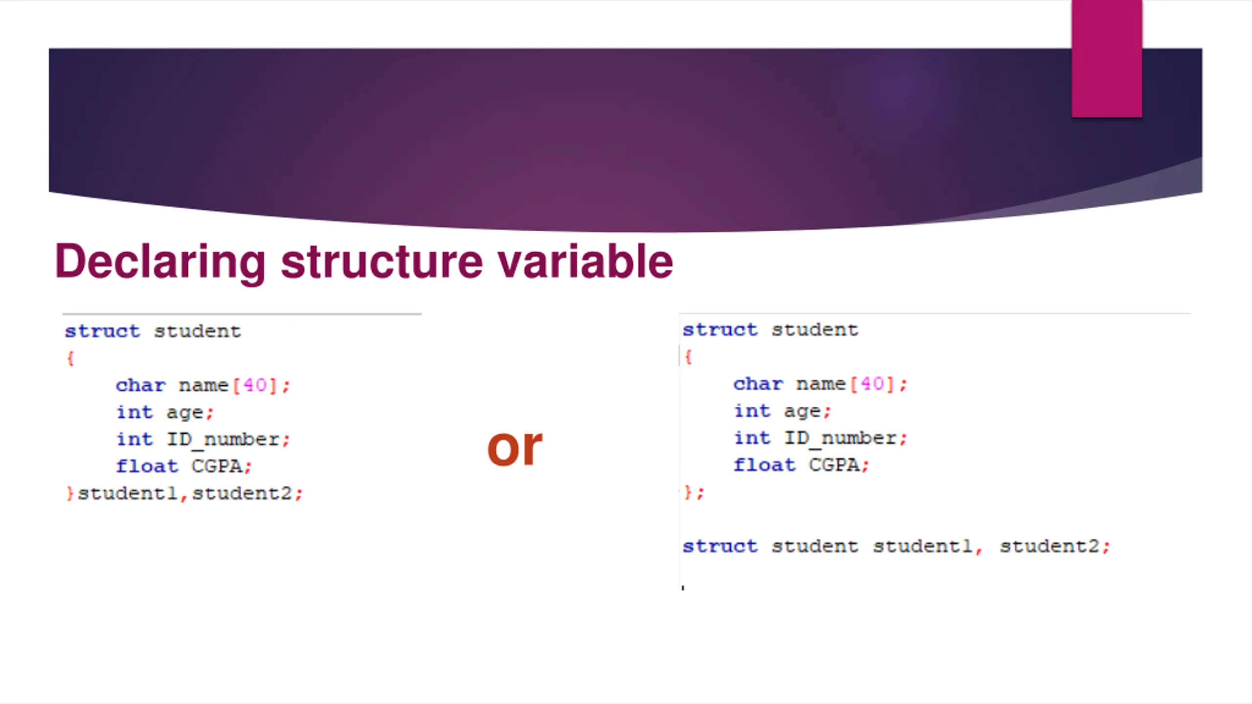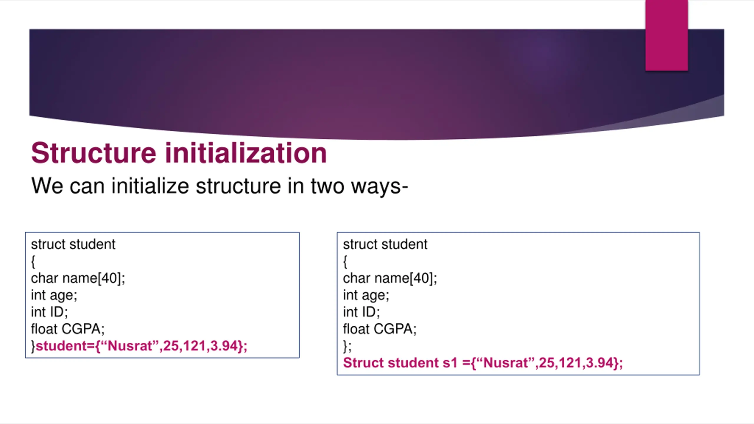 Structure initialization We can initialize structure in two ways- struct student { char name[40]; int age; int ID; float CGPA; }student={ Nusrat ,25,121,3.94}; struct student { char name[40]; int age; int ID; float CGPA; }; Struct student s1 ={ Nusrat ,25,121,3.94};