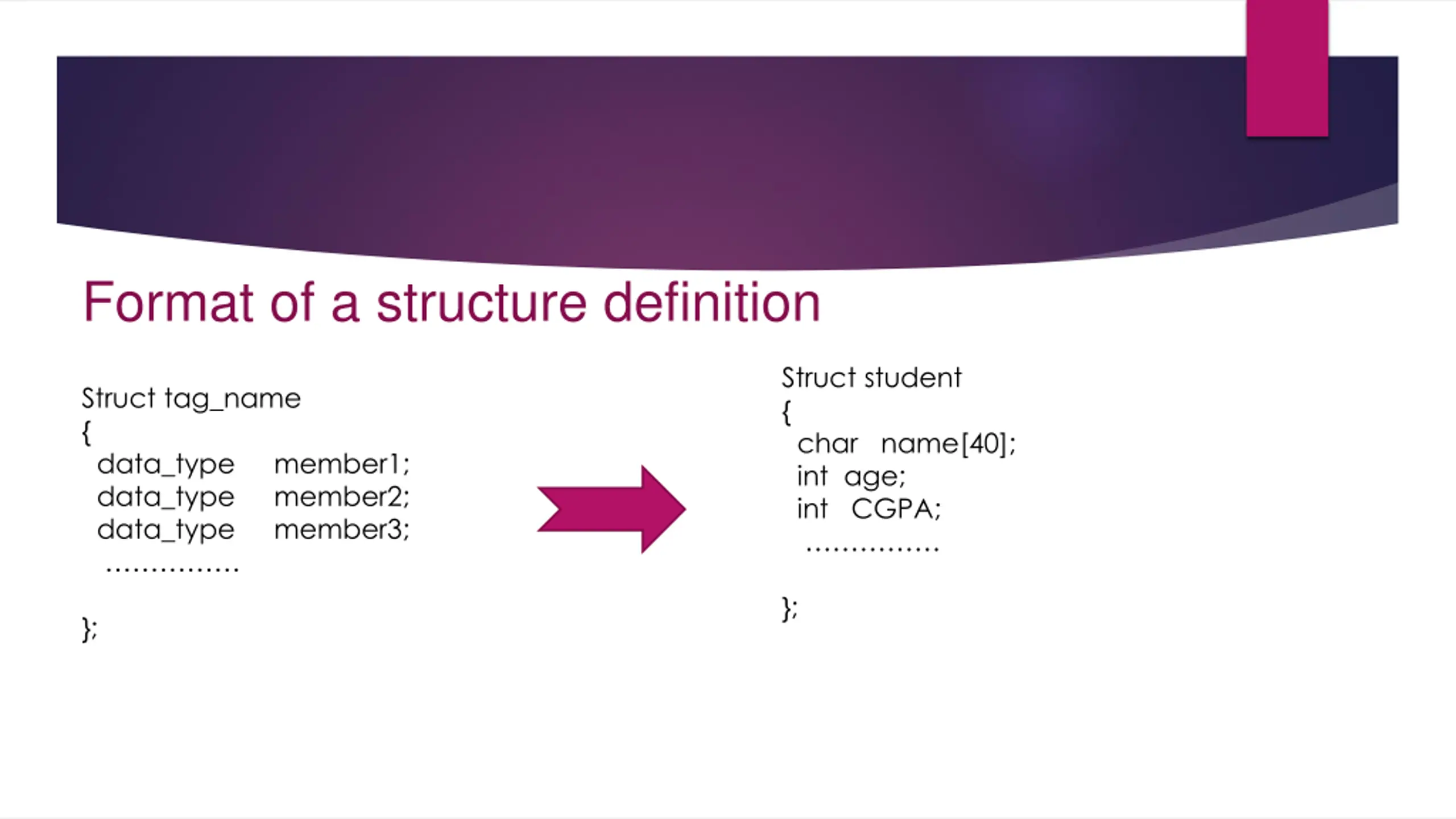 Format of a structure definition Struct student { char name[40]; int age; int CGPA; Struct tag_name { data_type member1; data_type member2; data_type member3; }; };