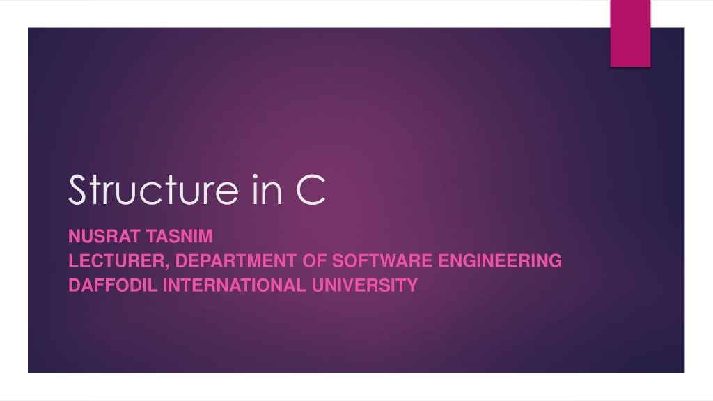 Structure in C NUSRAT TASNIM LECTURER, DEPARTMENT OF SOFTWARE ENGINEERING DAFFODIL INTERNATIONAL UNIVERSITY