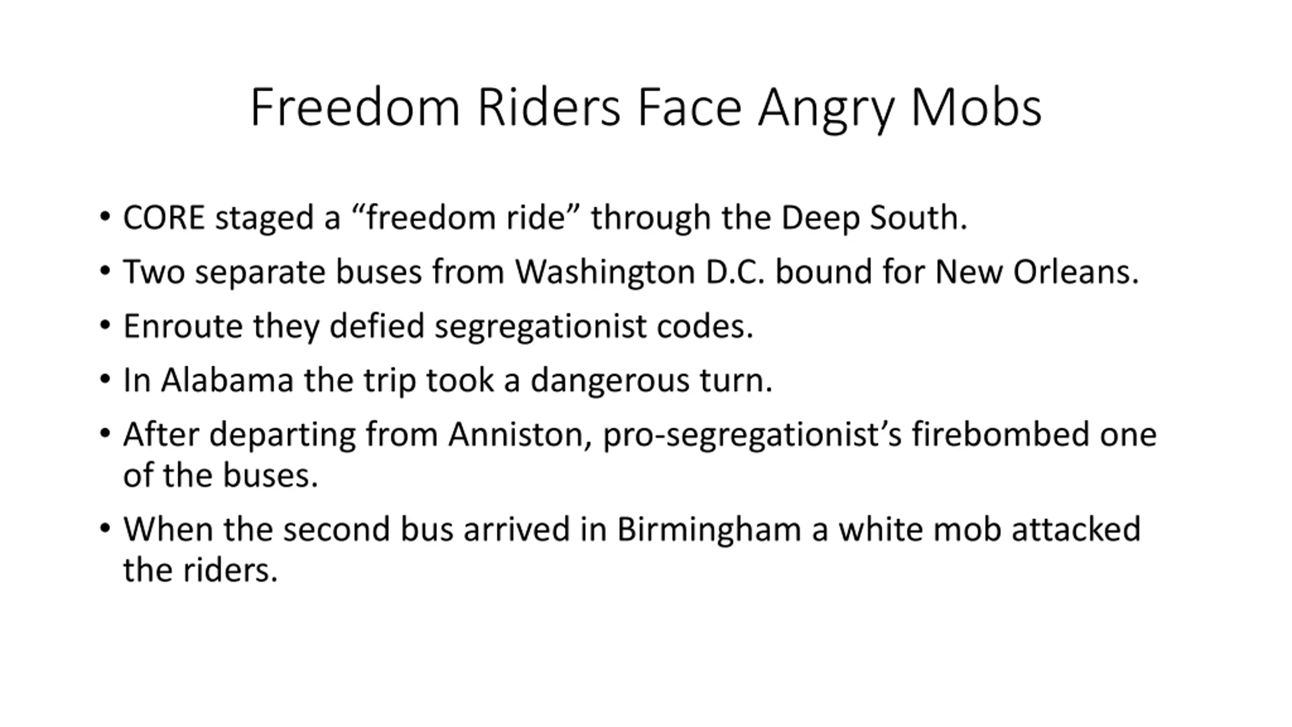 Freedom Riders Face Angry Mobs CORE staged a freedom ride through the Deep South. Two separate buses from Washington D.C. bound for New Orleans. Enroute they defied segregationist codes. In Alabama the trip took a dangerous turn. After departing from Anniston, pro-segregationist s firebombed one of the buses. When the second bus arrived in Birmingham a white mob attacked the riders.