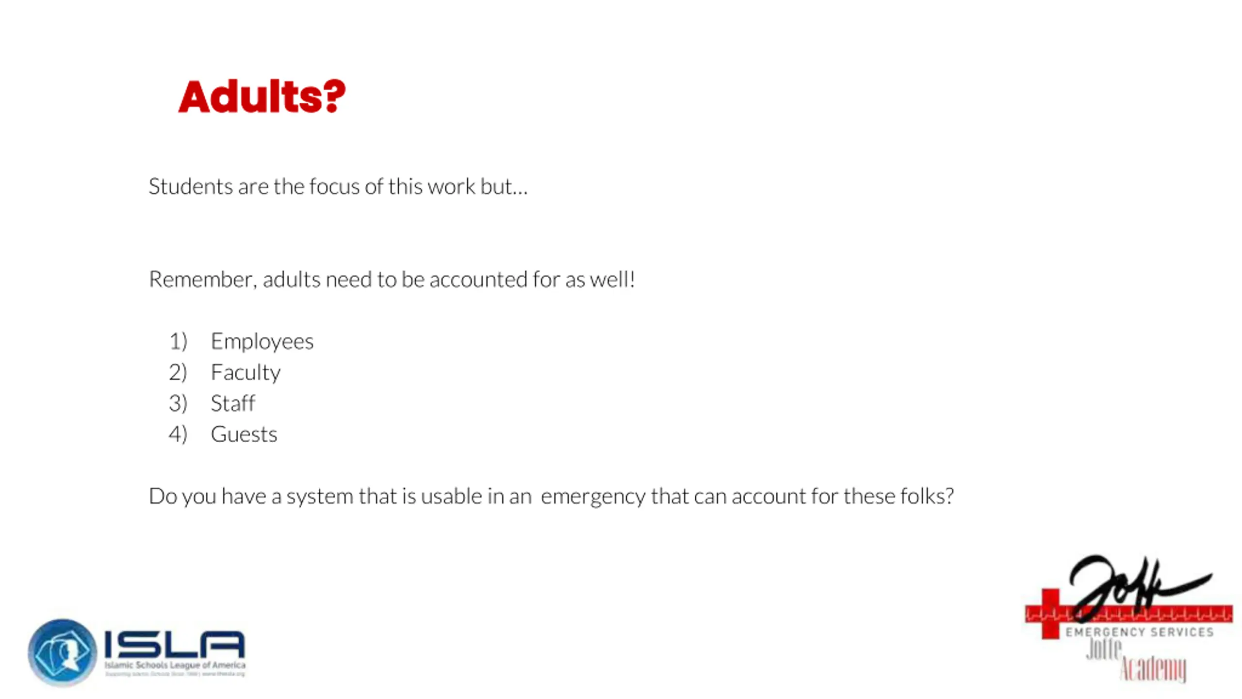 Adults? Adults? Students are the focus of this work but Remember, adults need to be accounted for as well! 1) 2) 3) 4) Employees Faculty Staff Guests Do you have a system that is usable in an emergency that can account for these folks?