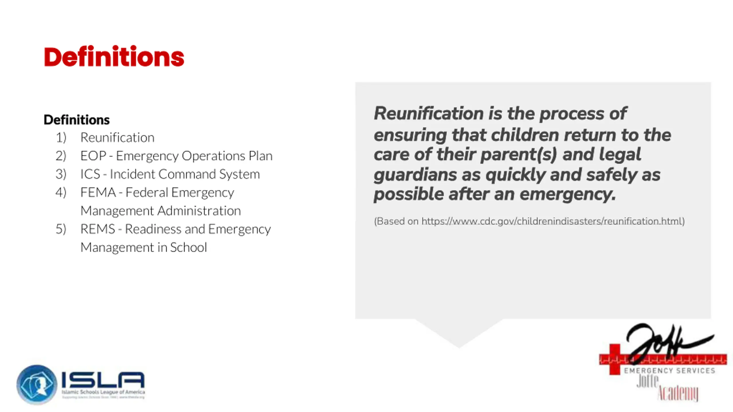 Definitions Definitions Reunification Reunification is is the ensuring ensuring that that children care care of of their their parent(s) guardians guardians as as quickly possible possible after after an the process process of children return parent(s) and quickly and and safely an emergency. emergency. of Definitions Definitions 1) 2) 3) 4) return to and legal legal safely as to the the Reunification EOP -Emergency Operations Plan ICS -Incident Command System FEMA -Federal Emergency Management Administration REMS -Readiness and Emergency Management in School as (Based on https://www.cdc.gov/childrenindisasters/reunification.html) 5)