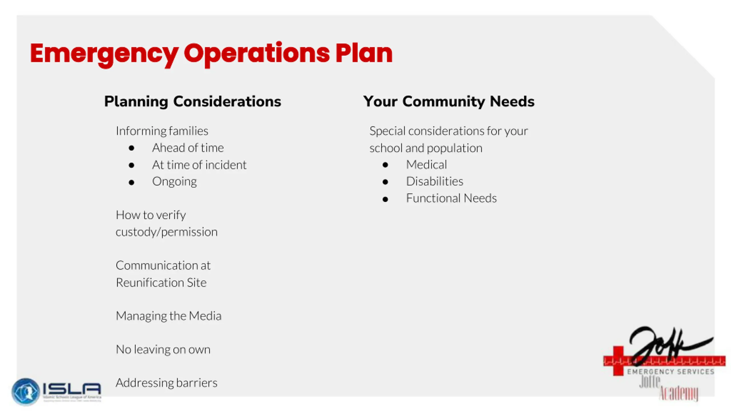 Emergency Operations Plan Emergency Operations Plan Planning Considerations Your Community Needs Informing families Ongoing Special considerations for your school and population Functional Needs Ahead of time At time of incident Medical Disabilities How to verify custody/permission Communication at Reunification Site Managing the Media No leaving on own Addressing barriers