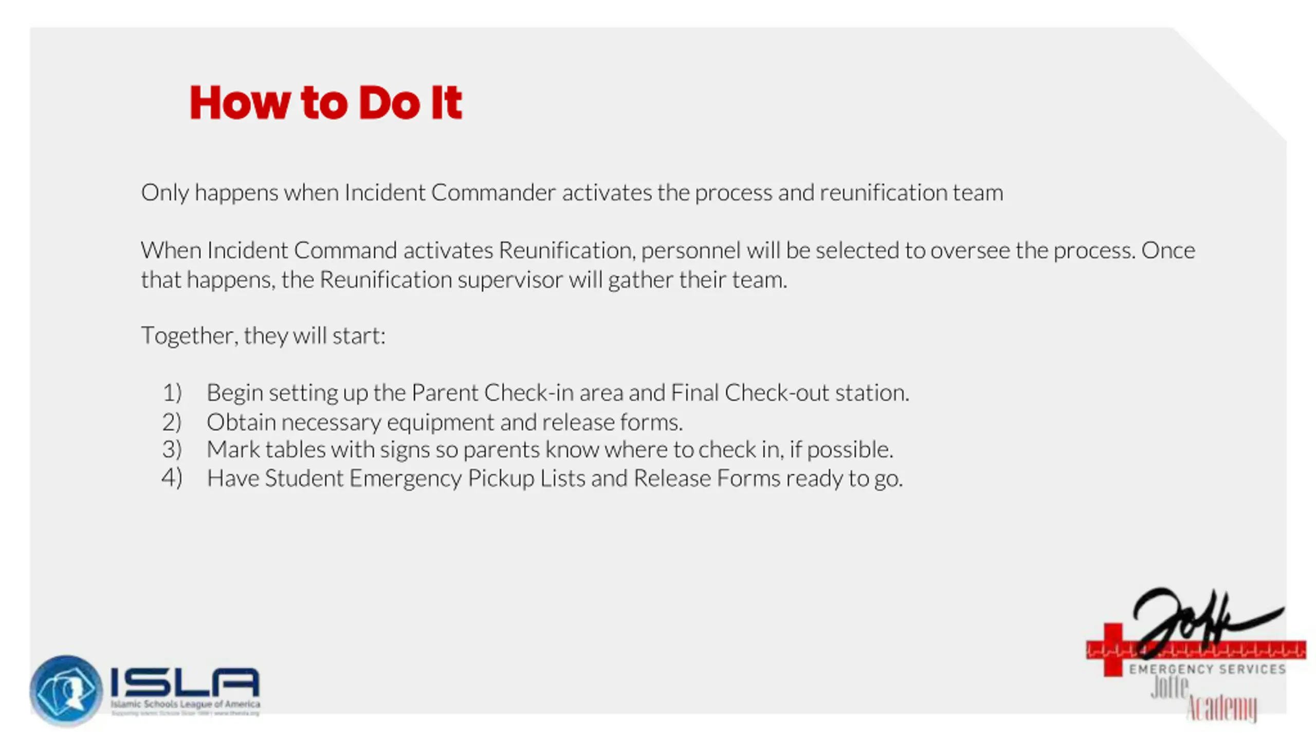 How to Do It How to Do It Only happens when Incident Commander activates the process and reunification team When Incident Command activates Reunification, personnel will be selected to oversee the process. Once that happens, the Reunification supervisor will gather their team. Together, they will start: 1) 2) 3) 4) Begin setting up the Parent Check-in area and Final Check-out station. Obtain necessary equipment and release forms. Mark tables with signs so parents know where to check in, if possible. Have Student Emergency Pickup Lists and Release Forms ready to go.