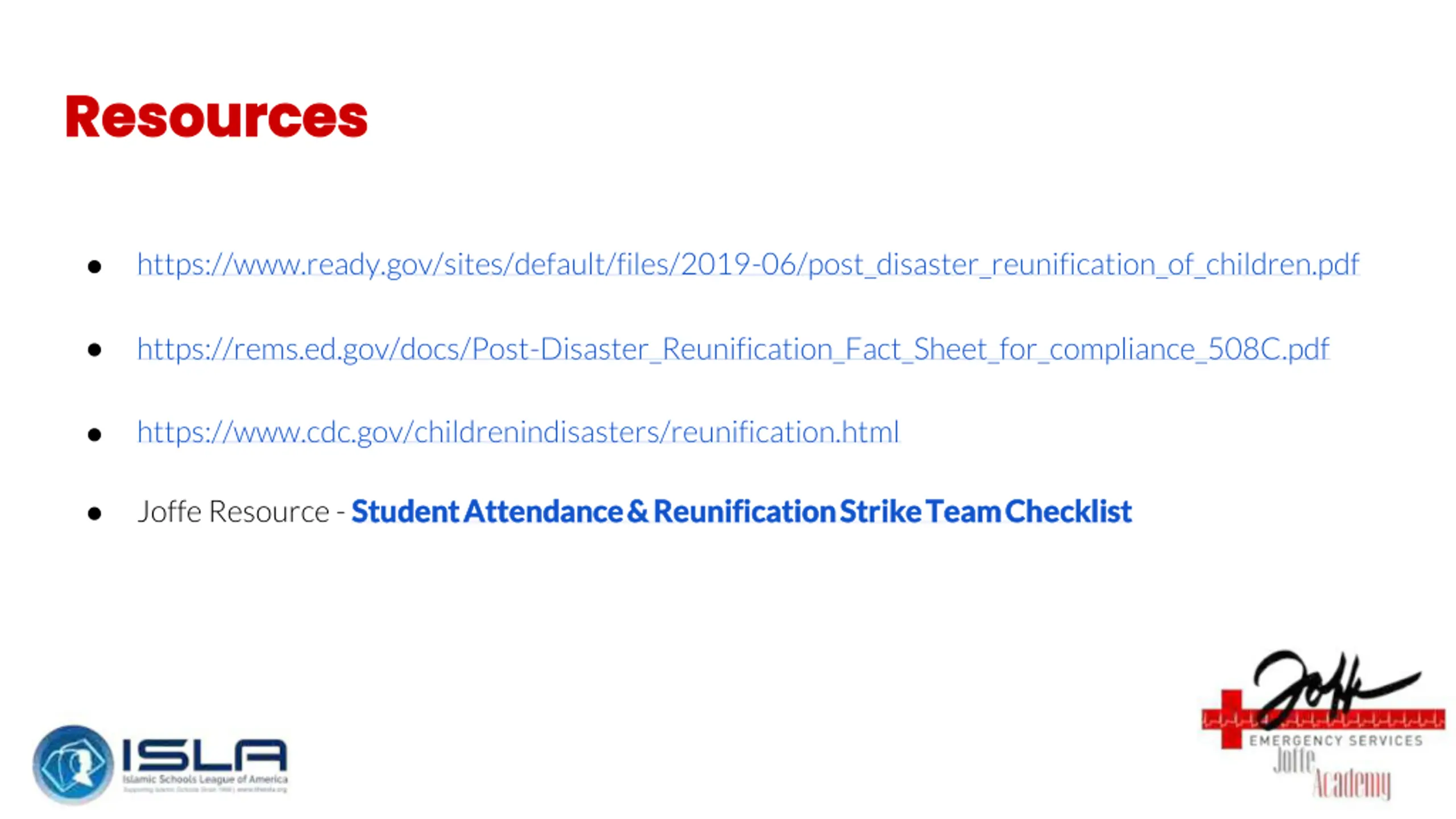 Resources Resources https://www.ready.gov/sites/default/files/2019-06/post_disaster_reunification_of_children.pdf https://rems.ed.gov/docs/Post-Disaster_Reunification_Fact_Sheet_for_compliance_508C.pdf https://www.cdc.gov/childrenindisasters/reunification.html Joffe Resource -Student StudentAttendance Attendance& &Reunification ReunificationStrike StrikeTeam TeamChecklist Checklist
