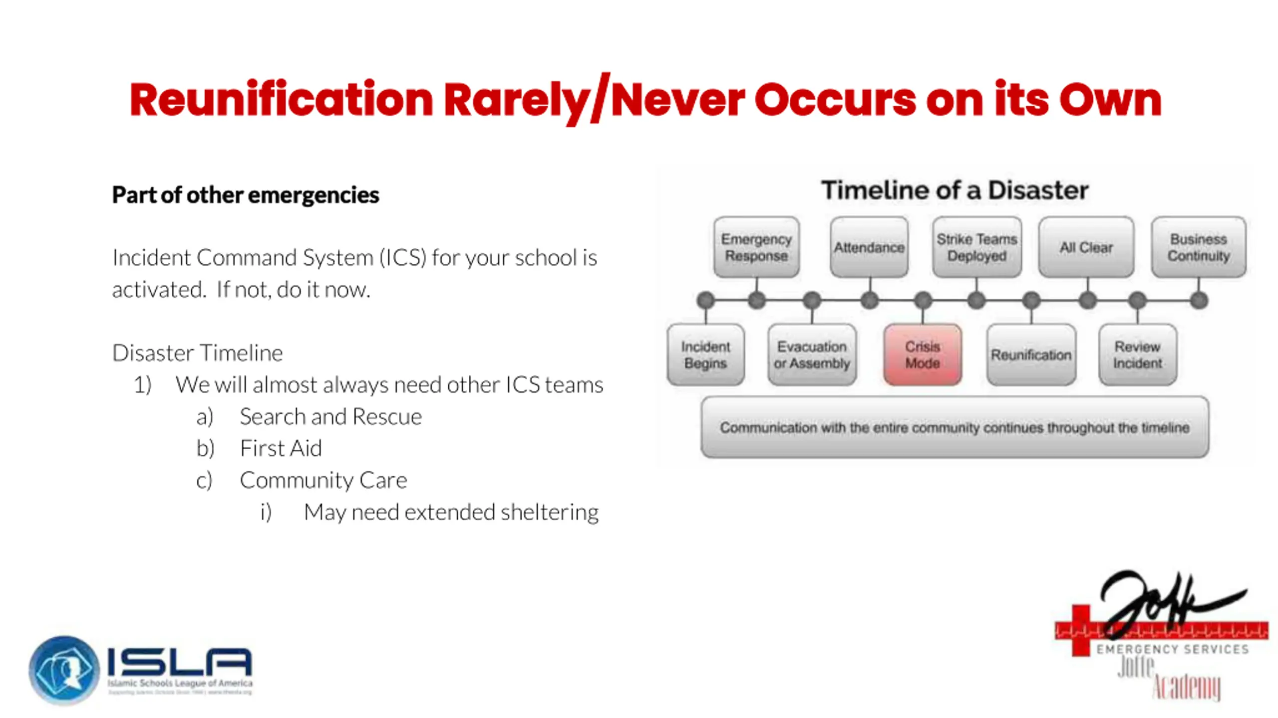 Reunification Rarely/Never Occurs on its Own Reunification Rarely/Never Occurs on its Own Part of other emergencies Part of other emergencies Incident Command System (ICS) for your school is activated. If not, do it now. Disaster Timeline 1) We will almost always need other ICS teams a) Search and Rescue b) First Aid c) Community Care i) May need extended sheltering