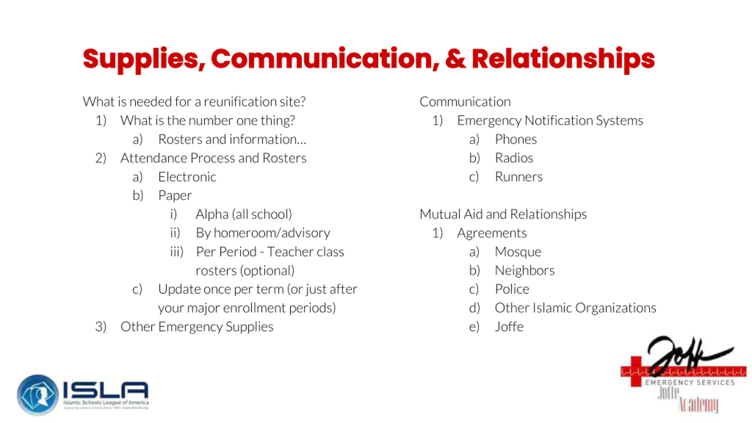 Supplies, Communication, & Relationships Supplies, Communication, & Relationships What is needed for a reunification site? 1) What is the number one thing? a) Rosters and information 2) Attendance Process and Rosters a) Electronic b) Paper i) ii) iii) Per Period - Teacher class rosters (optional) c) Update once per term (or just after your major enrollment periods) 3) Other Emergency Supplies Communication 1) Emergency Notification Systems a) Phones b) Radios c) Runners Alpha (all school) By homeroom/advisory Mutual Aid and Relationships 1) Agreements a) Mosque b) Neighbors c) Police d) Other Islamic Organizations e) Joffe