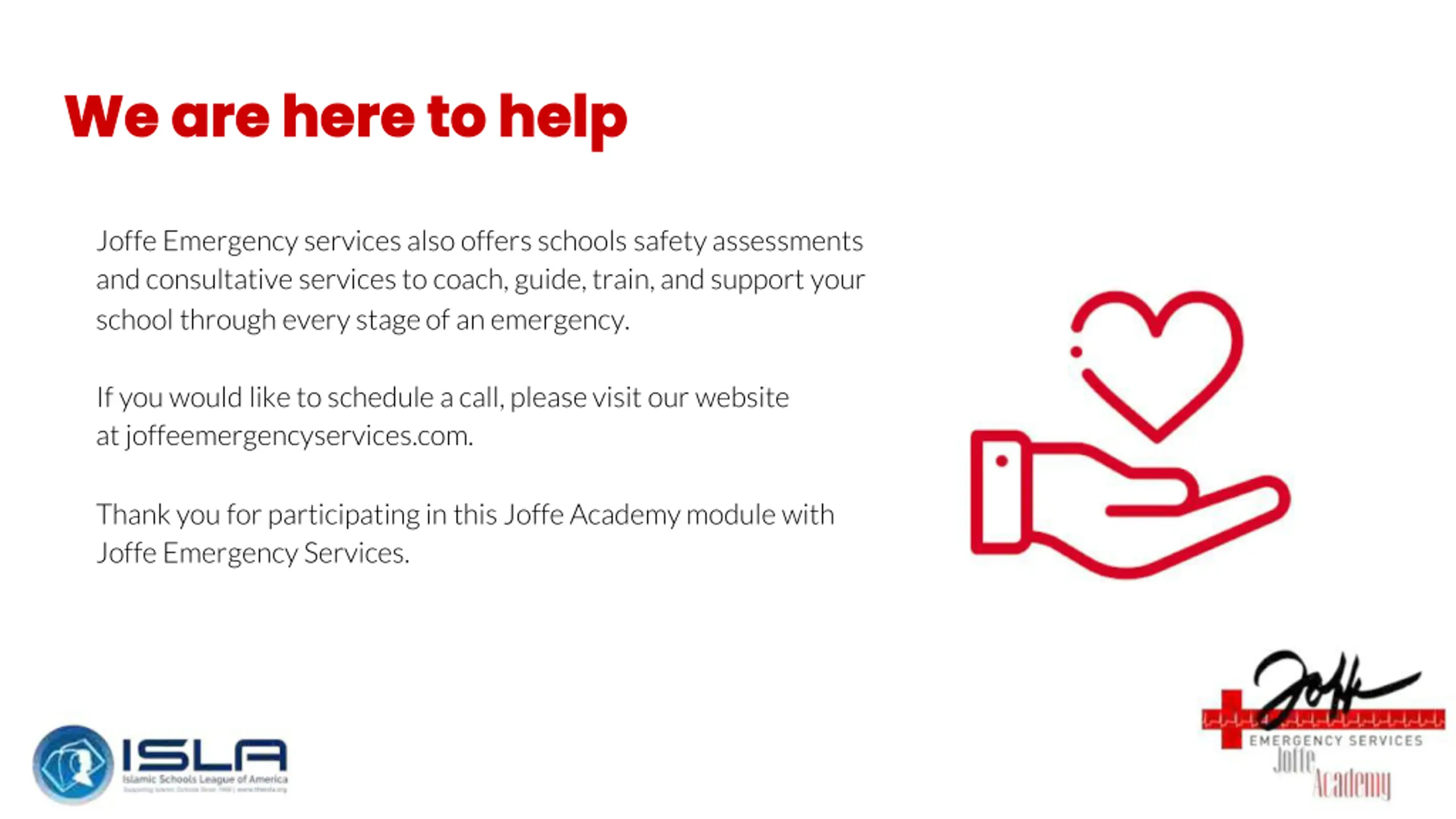 We We are are here here to to help help Joffe Emergency services also offers schools safety assessments and consultative services to coach, guide, train, and support your school through every stage of an emergency. If you would like to schedule a call, please visit our website at joffeemergencyservices.com. Thank you for participating in this Joffe Academy module with Joffe Emergency Services.