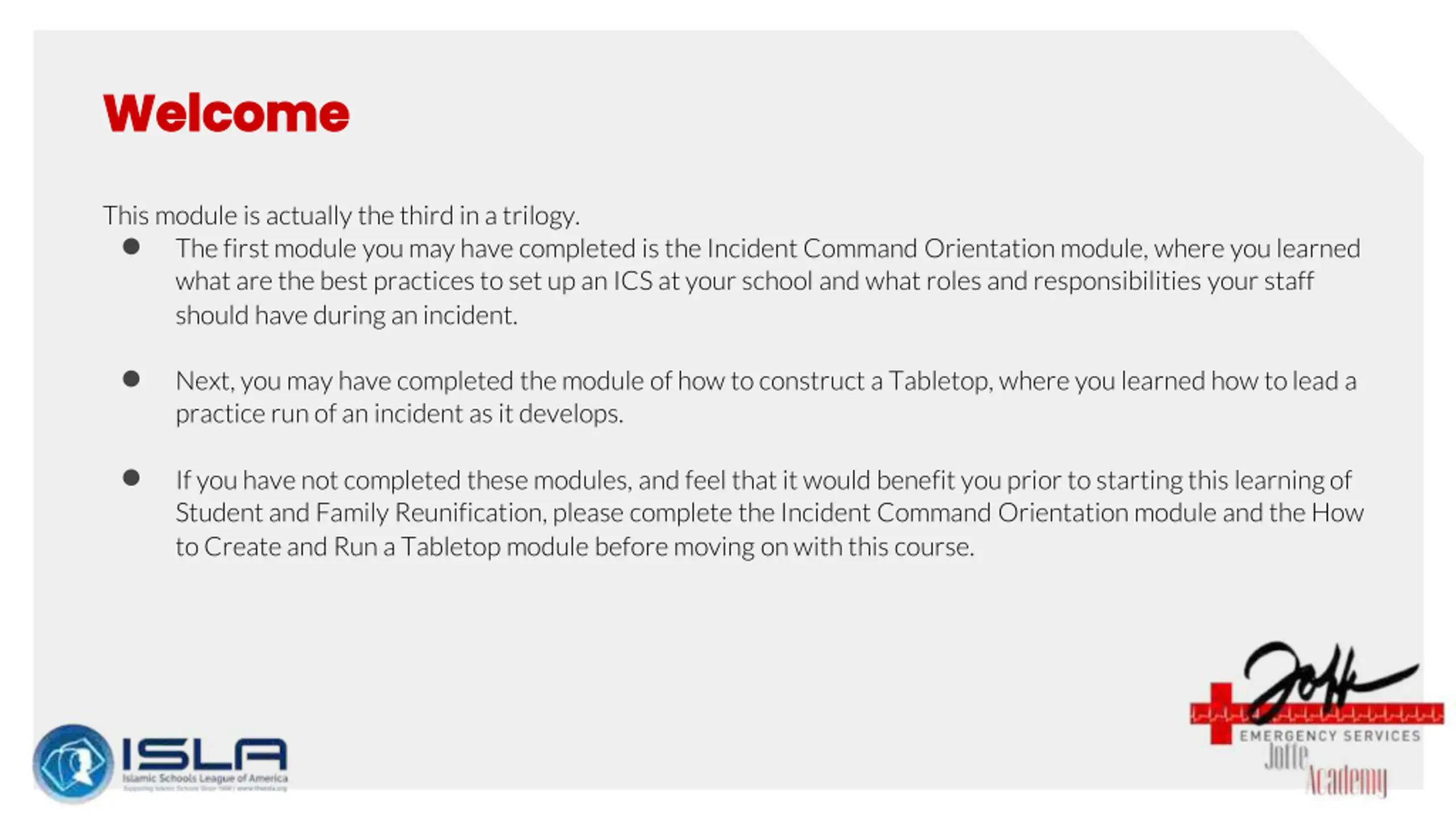Welcome Welcome This module is actually the third in a trilogy. The first module you may have completed is the Incident Command Orientation module, where you learned what are the best practices to set up an ICS at your school and what roles and responsibilities your staff should have during an incident. Next, you may have completed the module of how to construct a Tabletop, where you learned how to lead a practice run of an incident as it develops. If you have not completed these modules, and feel that it would benefit you prior to starting this learning of Student and Family Reunification, please complete the Incident Command Orientation module and the How to Create and Run a Tabletop module before moving on with this course.