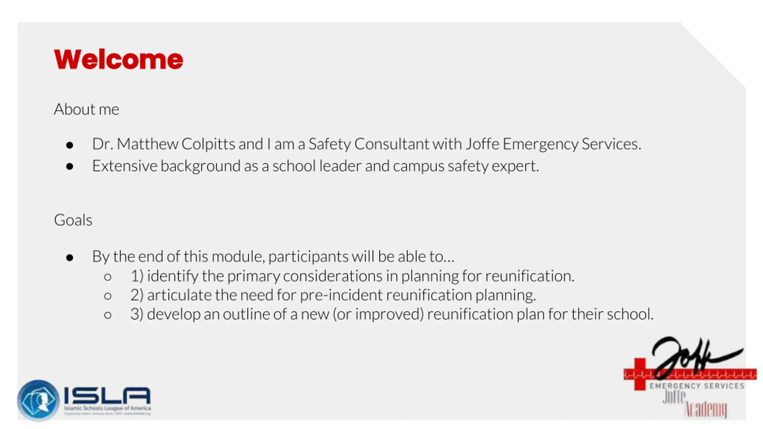 Welcome Welcome About me Dr. Matthew Colpitts and I am a Safety Consultant with Joffe Emergency Services. Extensive background as a school leader and campus safety expert. Goals By the end of this module, participants will be able to 3) develop an outline of a new (or improved) reunification plan for their school. 1) identify the primary considerations in planning for reunification. 2) articulate the need for pre-incident reunification planning.