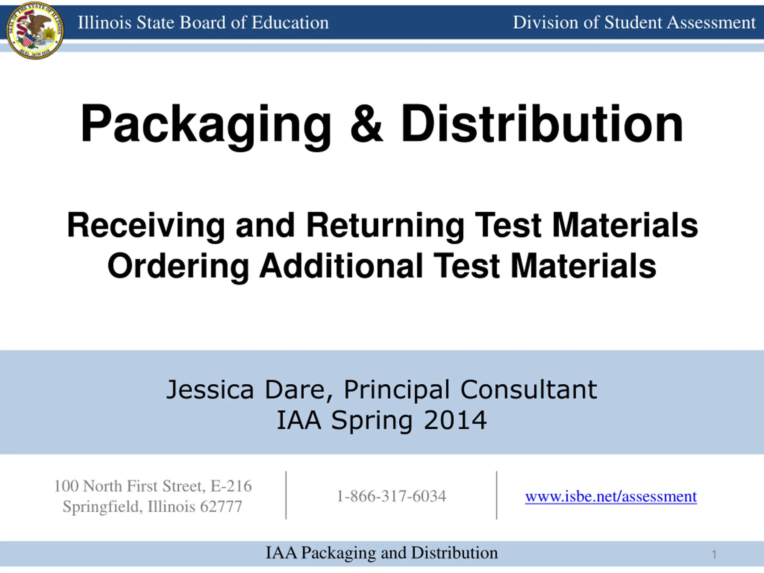 Division of Student Assessment Illinois State Board of Education Packaging & Distribution Receiving and Returning Test Materials Ordering Additional Test Materials Jessica Dare, Principal Consultant IAA Spring 2014 100 North First Street, E-216 Springfield, Illinois 62777 www.isbe.net/assessment www.isbe.net/assessment 1-866-317-6034 IAA Packaging and Distribution 1