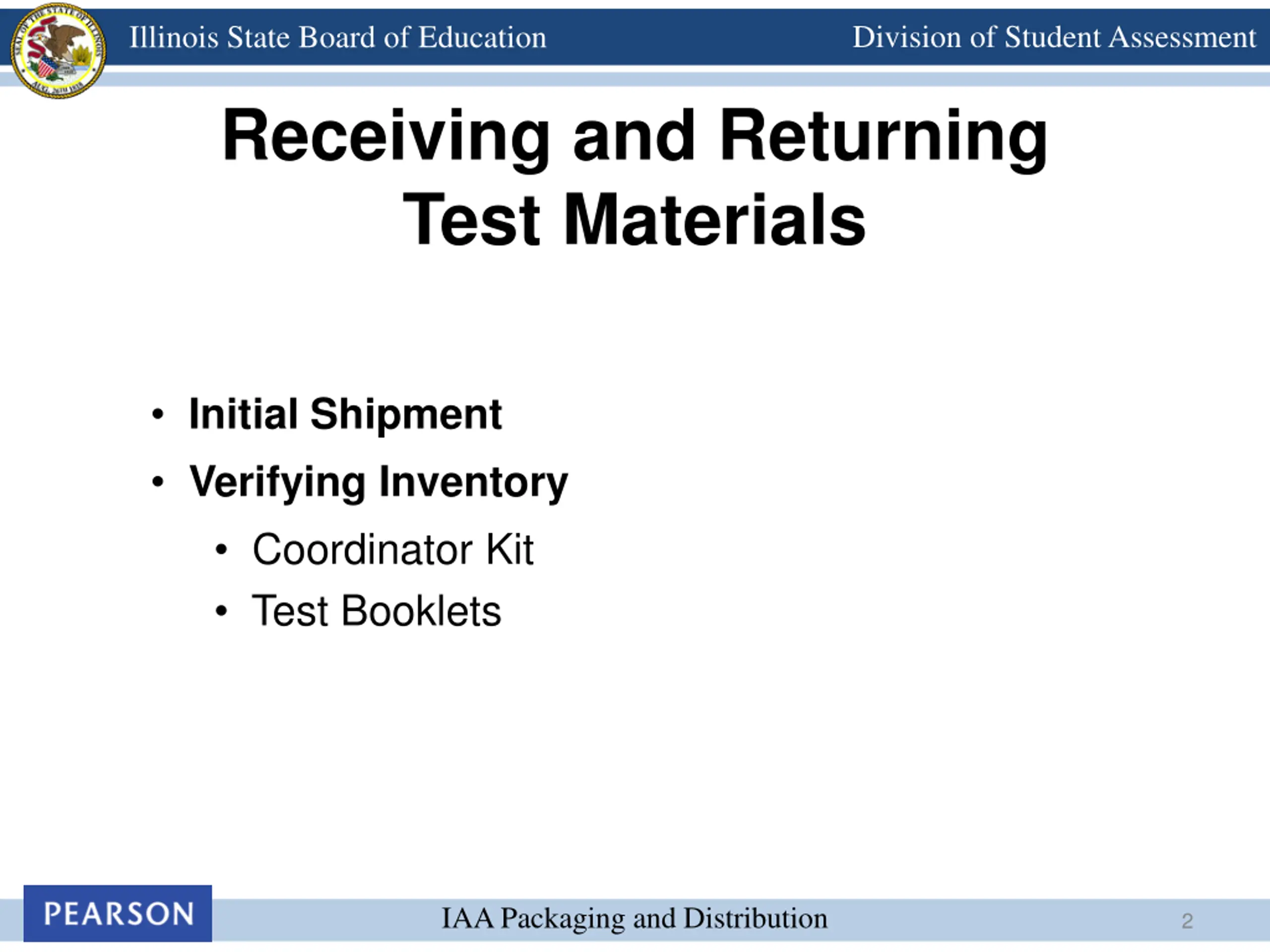 Division of Student Assessment Illinois State Board of Education Receiving and Returning Test Materials Initial Shipment Verifying Inventory Coordinator Kit Test Booklets IAA Packaging and Distribution 2
