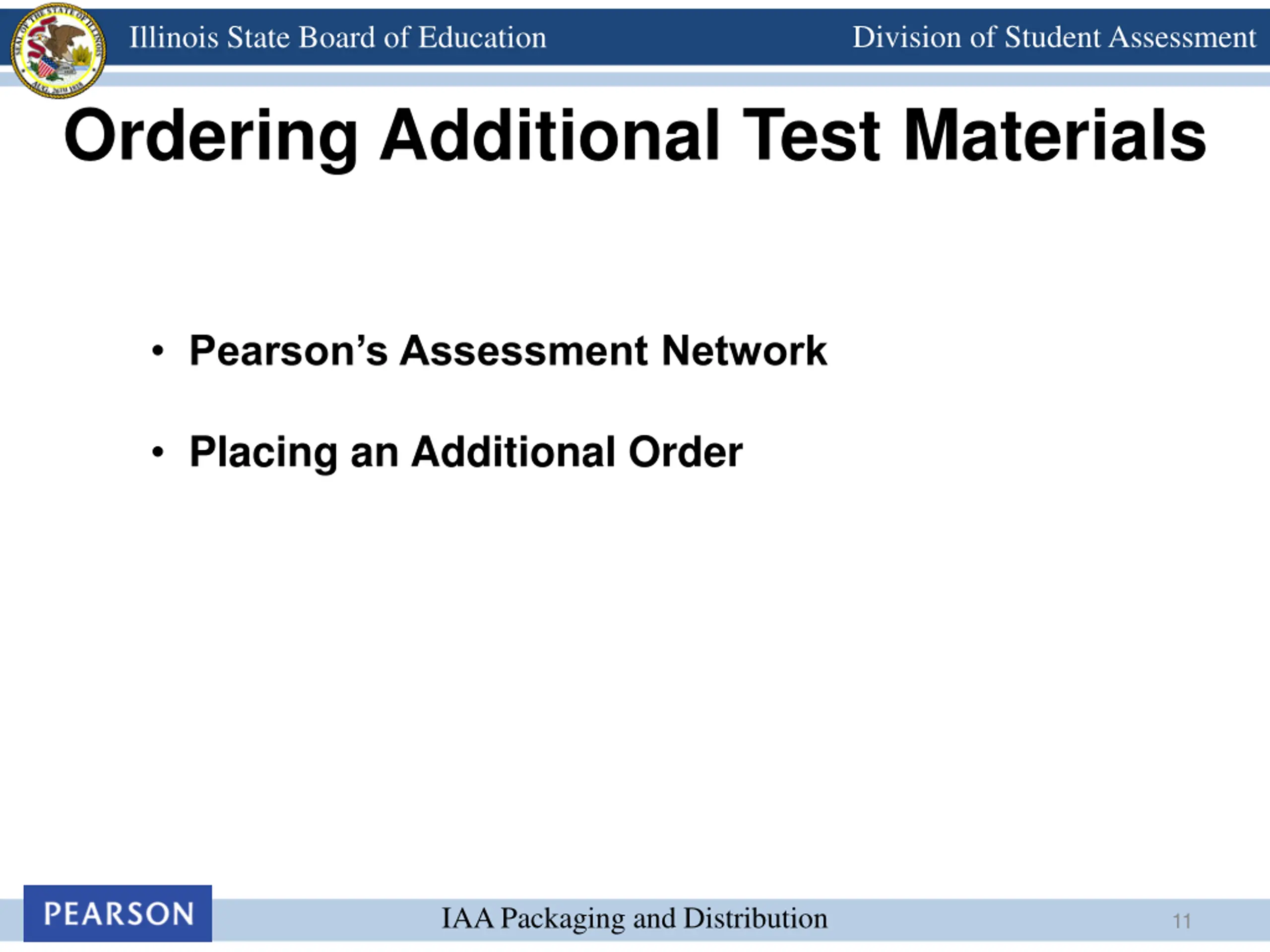 Division of Student Assessment Illinois State Board of Education Ordering Additional Test Materials Pearson s Assessment Network Placing an Additional Order IAA Packaging and Distribution 11