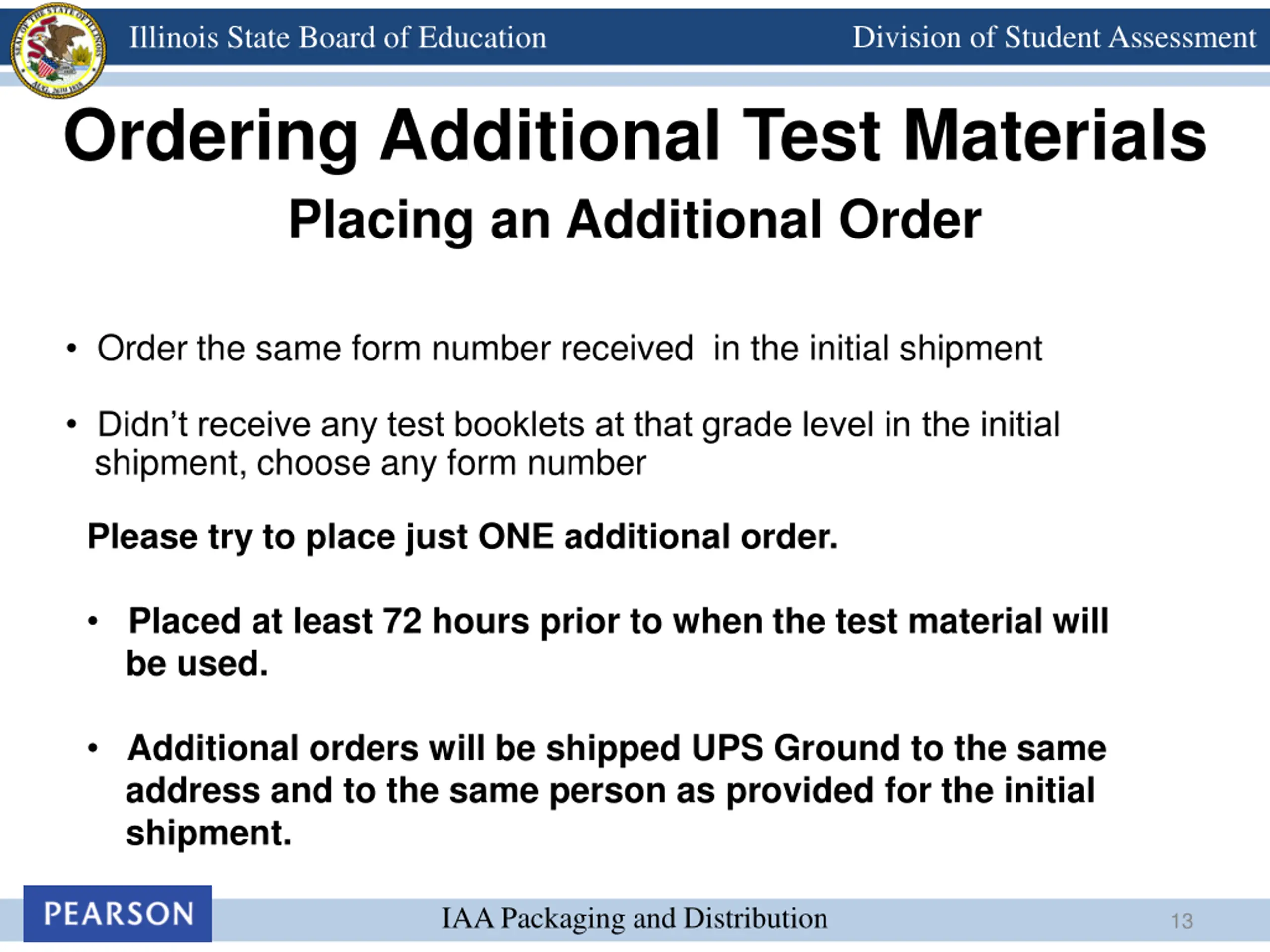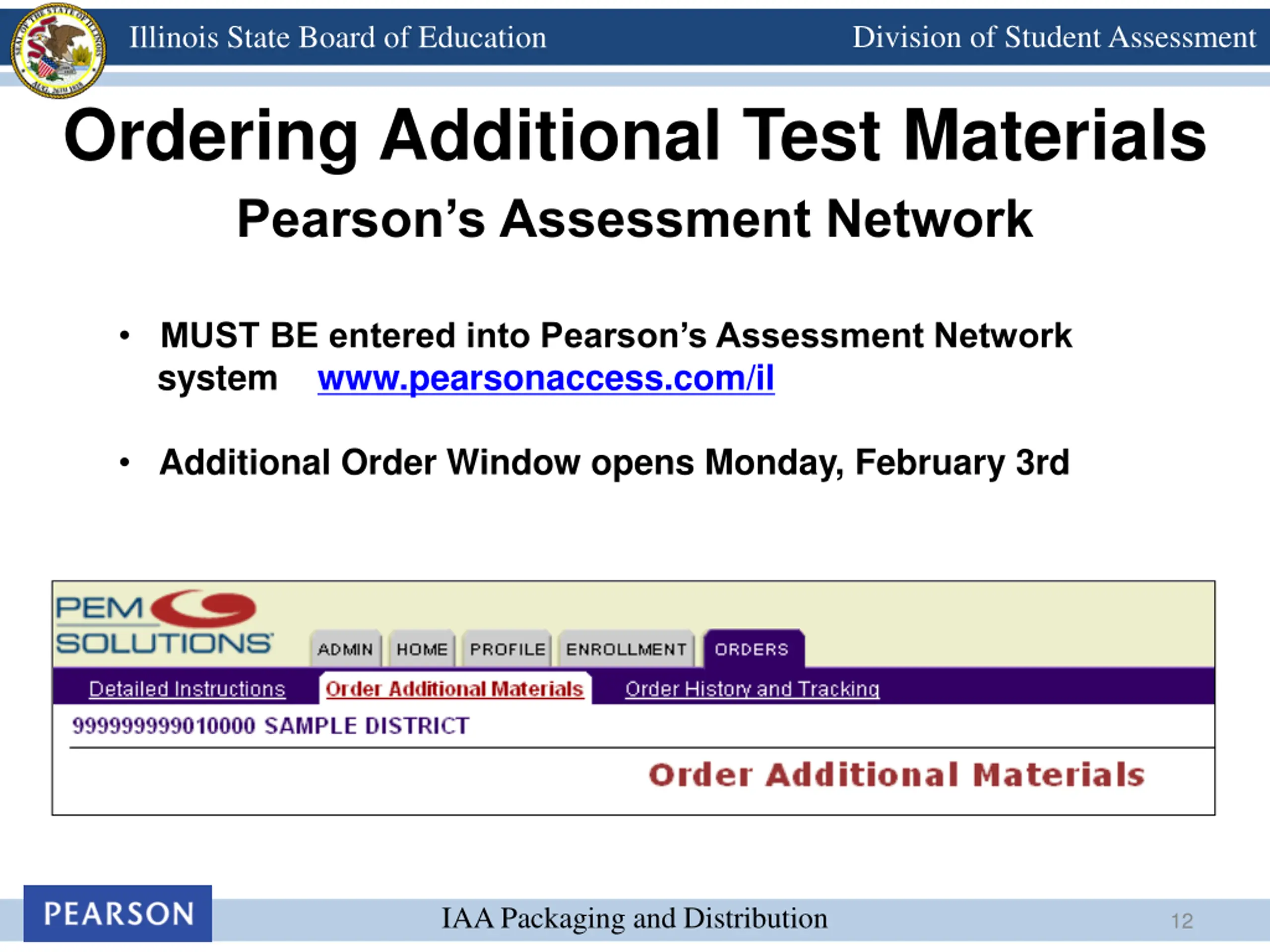 Division of Student Assessment Illinois State Board of Education Ordering Additional Test Materials Pearson s Assessment Network MUST BE entered into Pearson s Assessment Network system www.pearsonaccess.com/il Additional Order Window opens Monday, February 3rd IAA Packaging and Distribution 12