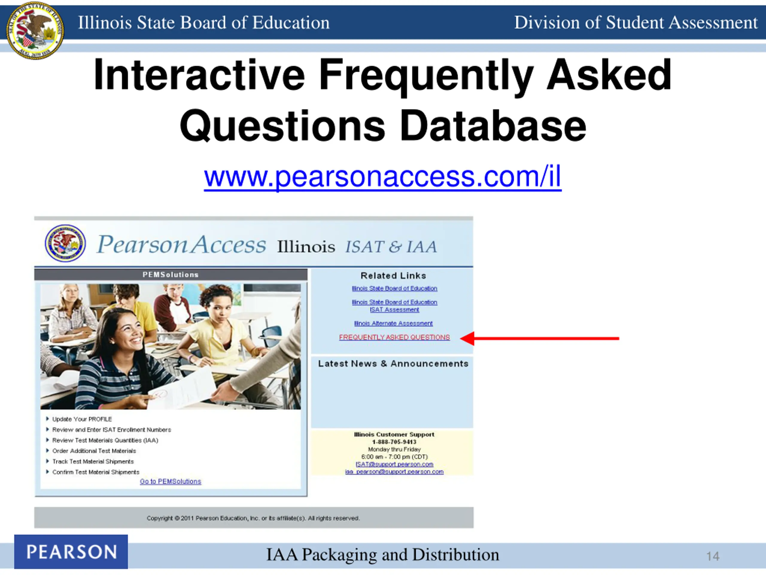 Division of Student Assessment Illinois State Board of Education Interactive Frequently Asked Questions Database www.pearsonaccess.com/il IAA Packaging and Distribution 14