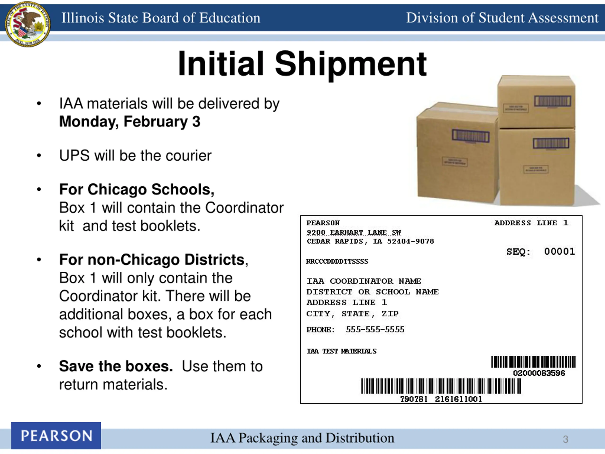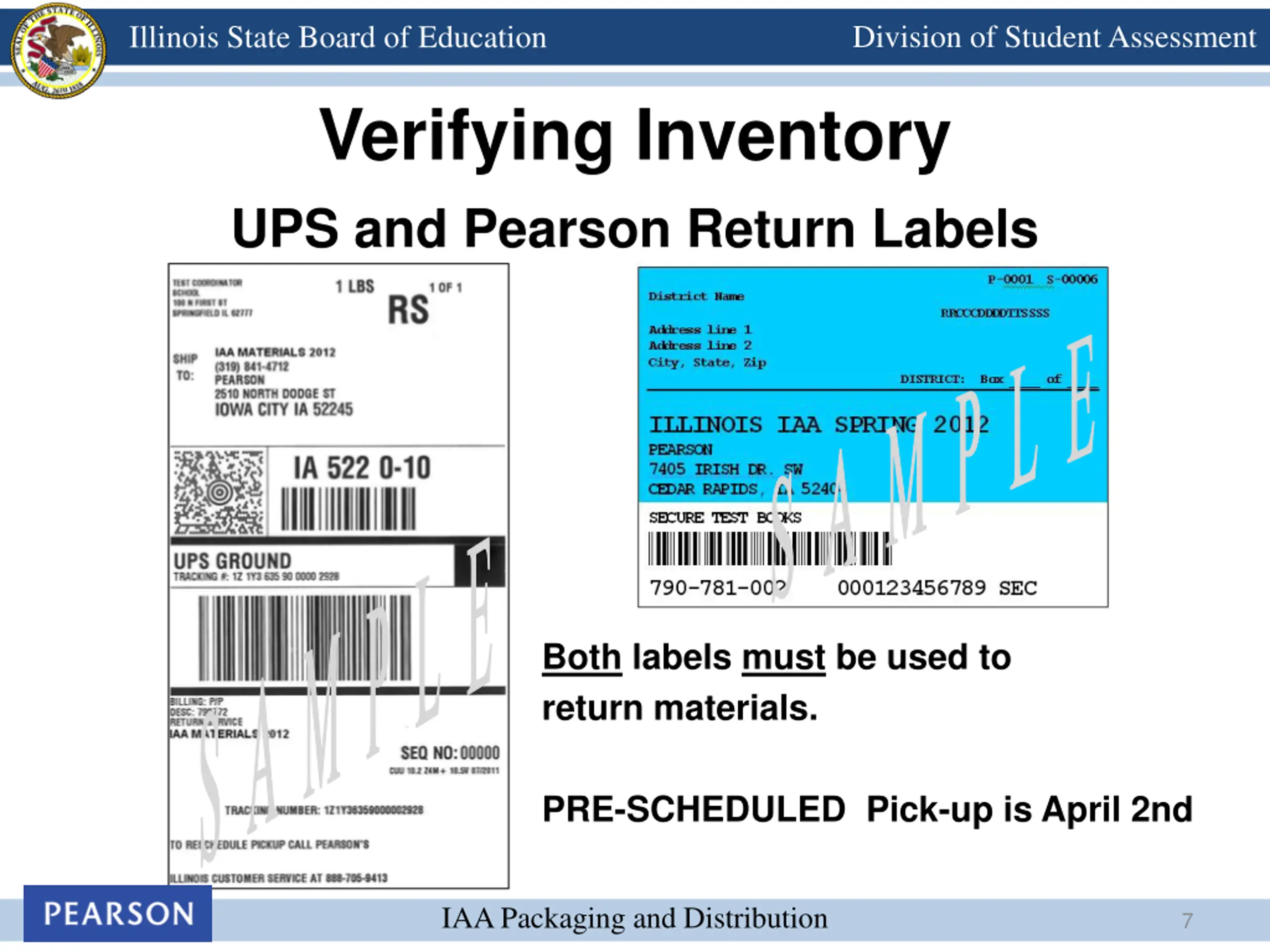 Division of Student Assessment Illinois State Board of Education Verifying Inventory UPS and Pearson Return Labels S A M P L E S A M P L E Both labels must be used to return materials. PRE-SCHEDULED Pick-up is April 2nd IAA Packaging and Distribution 7