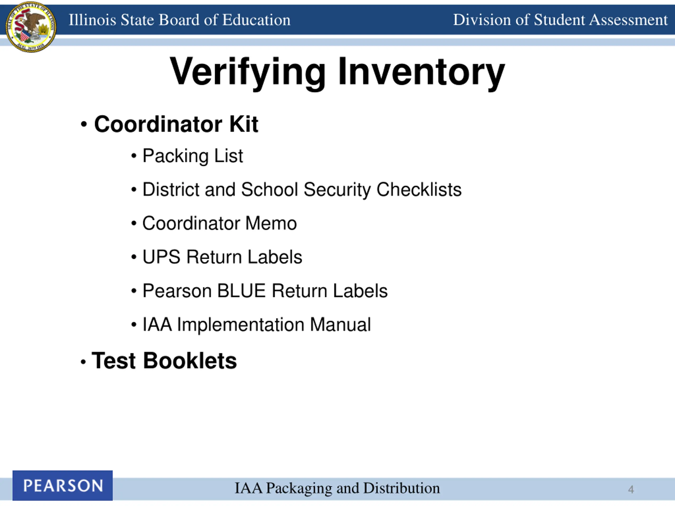 Division of Student Assessment Illinois State Board of Education Verifying Inventory Coordinator Kit Packing List District and School Security Checklists Coordinator Memo UPS Return Labels Pearson BLUE Return Labels IAA Implementation Manual Test Booklets IAA Packaging and Distribution 4